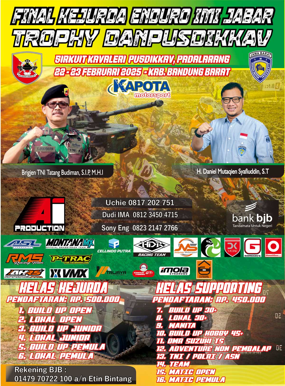 Bagi para penonton dan komunitas otomotif, jangan lewatkan kesempatan untuk menyaksikan langsung pertarungan sengit para pembalap terbaik Jawa Barat dalam ajang Final Kejurda Enduro IMI Jabar – Trophy Danpusdikkav 2025!
