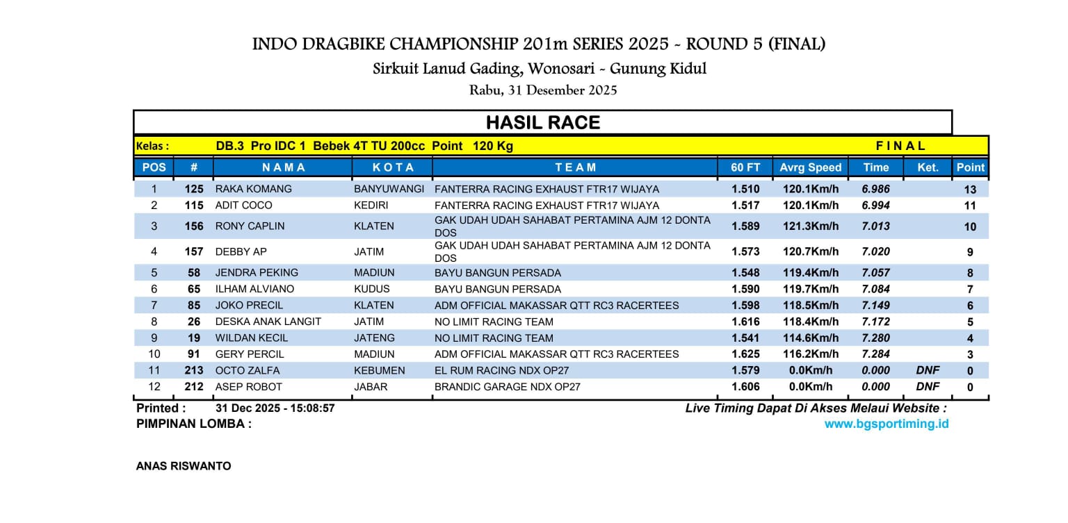 Dua juru tembak yang dipercaya yaitu Raka Komang dan Adit Coco buktikan Ketangguhan mesin racikan Aris Wijaya. Ada Nama Raka menyabet podium pertama dengan catatan waktu tajam 6.986 detik. Lanjut Adit Menempel ketat di posisi kedua dengan waktu 6.994 detik.