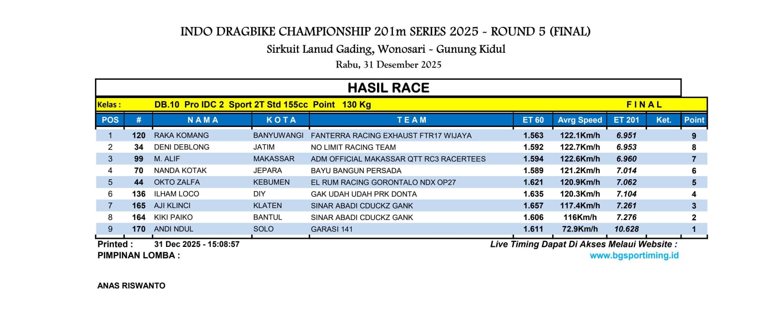 Meski hanya terpaut selisih tipis 0.002 detik dari Deni Deblong di posisi kedua, catatan waktu yang diraih Raka Komang tetap kokoh dan tidak terlampaui hingga akhir balapan.