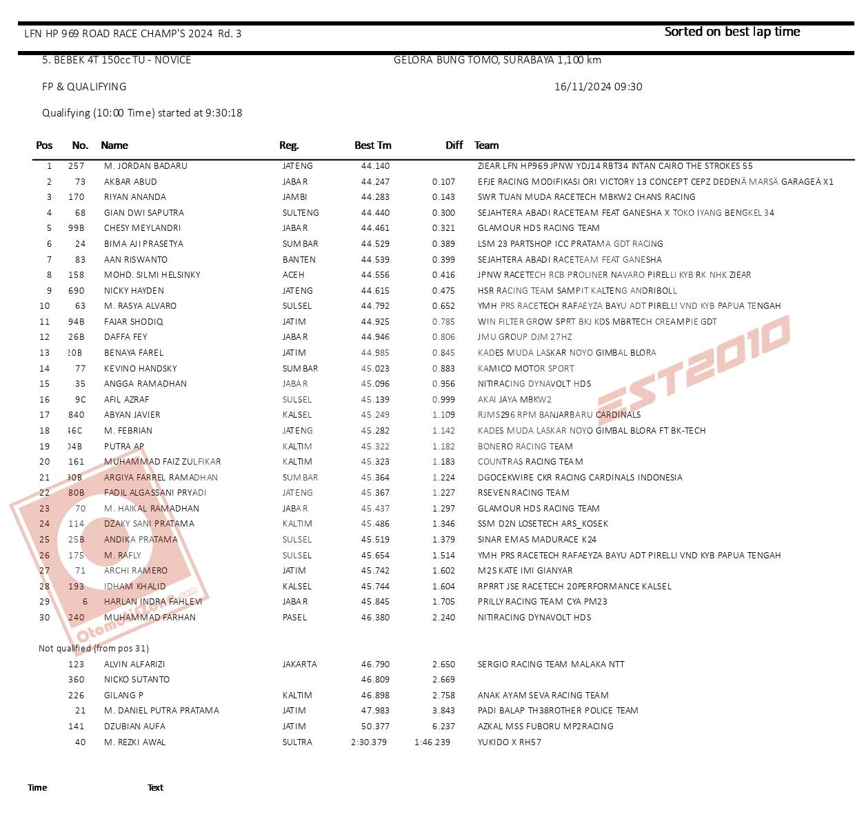 Berikut hasil Kualifikasi Bebek 4T 150 Novice. Kira kira posisi berapa pebalap andalan kalian?