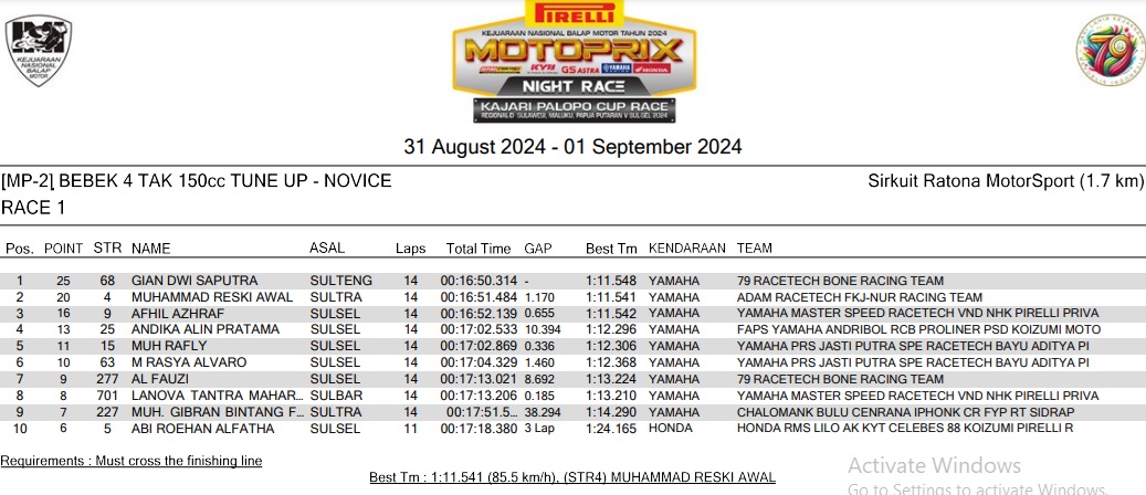 Dengan perubahan ini Gian berhasil amankan podium pertama dengan meninggalkan lawan sangat jauh. Sekali lagi selamat untuk Gian. Berikut hasil lombanya: