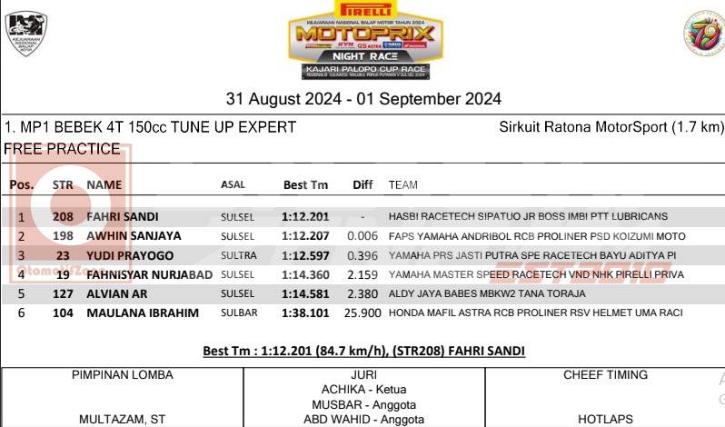 Fahri dan Awhin akan menjadi pesaing kuat untuk merebutkan Juara Region Expert 2024. Keduanya mempersiapkan semua dengan maksimal. Karena target dan tujuan sama, mereka ingin menyandang predikat Juara Region 2024. Lalu siapa yang akan menjadi juara sekaligus Juara Region Expert 2024. Kita tunggu setiap sesi Final Kejurnas Motoprix Region D 2024 hanya di OtomotifZone.com. Berikut hasil FP Expert: