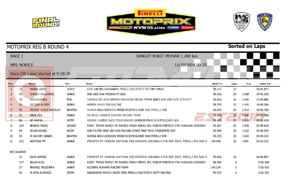 OtomotifZone.com – Tasikmalaya. Seru Race 1 Novice Kejurnas Motoprix Region B putaran 4 yang berlangsung (10/11/24) di Sirkuit Bukit Peusar Tasikmalaya, Jawa Barat. Akbar Abud mendapat perlawanan sengit dari Chessy Melandri yang membawa bendera tim SRG HDS SHA Trijaya PT GAS. Pebalap dengan nomor start 99 ini memberi perlawanan sengit kepada Abud. Namun Abud bisa mengatasi dan naik podium tertinggi.