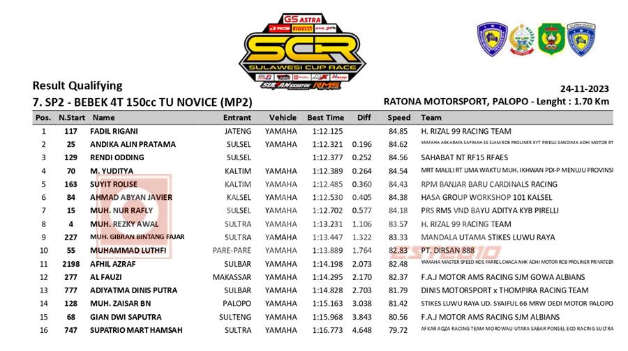 Pastinya ini menjadi evaluasi bagi tim untuk hadapi race nanti. Lalu kira kira apakah Fadli bisa menajdi juara pada race nanti? Kita tunggu saja kabar beritanya hanya di OtomotifZone.com. Berikut hasil kualifikasi MP2 atau Novice: