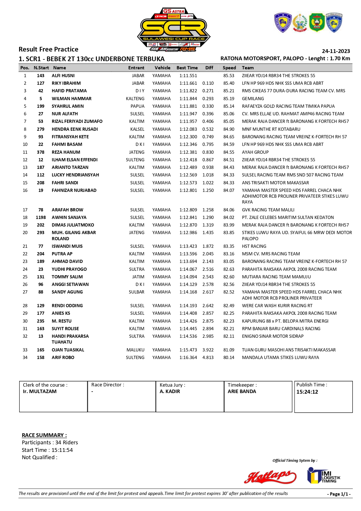 Lalu apakah Alfi mampu menjadi yang tercepat disetiap sesinya. Kita tunggu saja kabar beritanya hanya di OtomotifZone.com. Dan berikut adalah hasil FP Underbone 130 atau kelas SCR1: