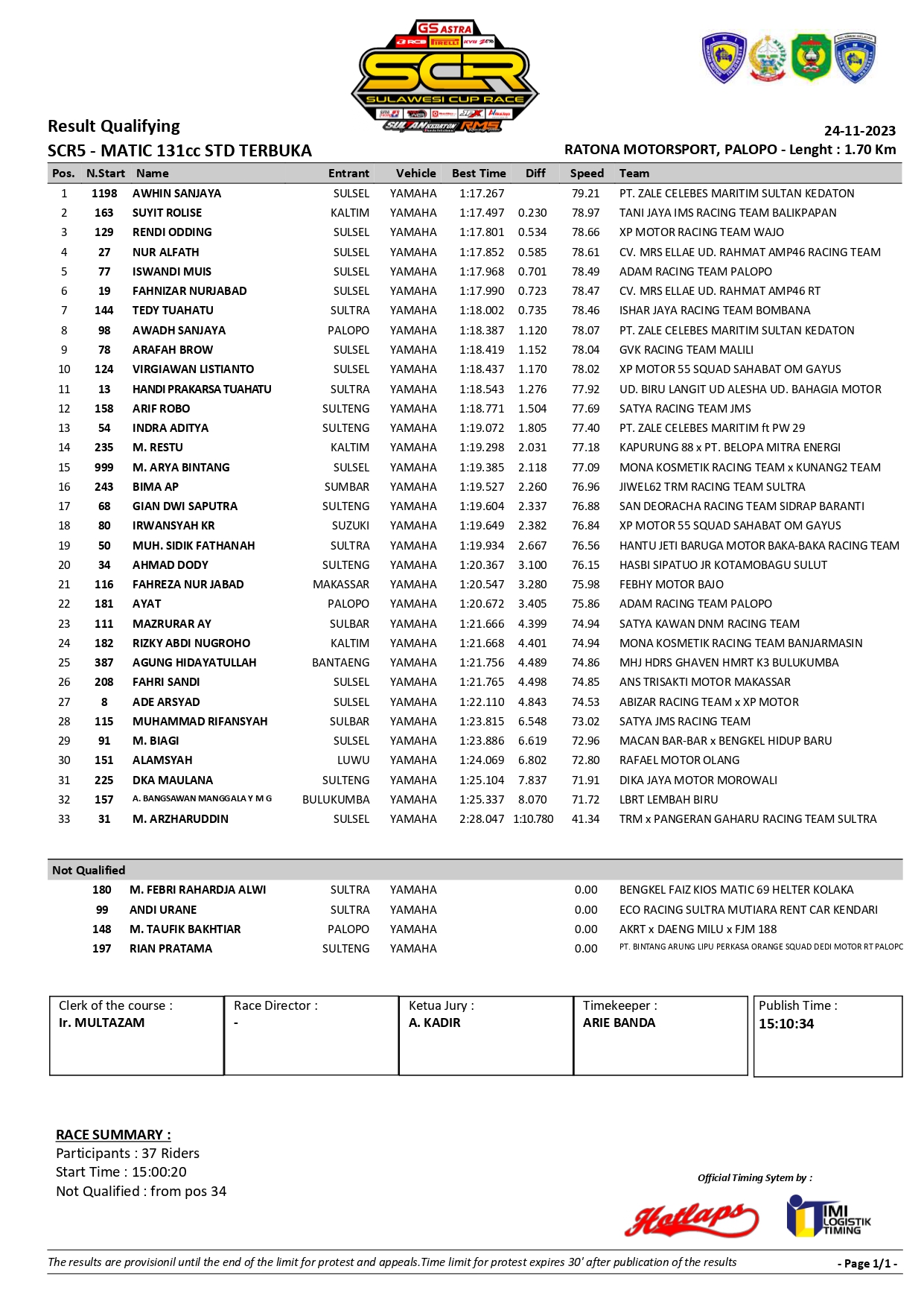 Dengan hasil ini membuat Awhin start dari posisi pertama dan Suyit harus puas start pada posisi kedua. Agar lebih jelas berikut hasil kualifikasi SCR5:
