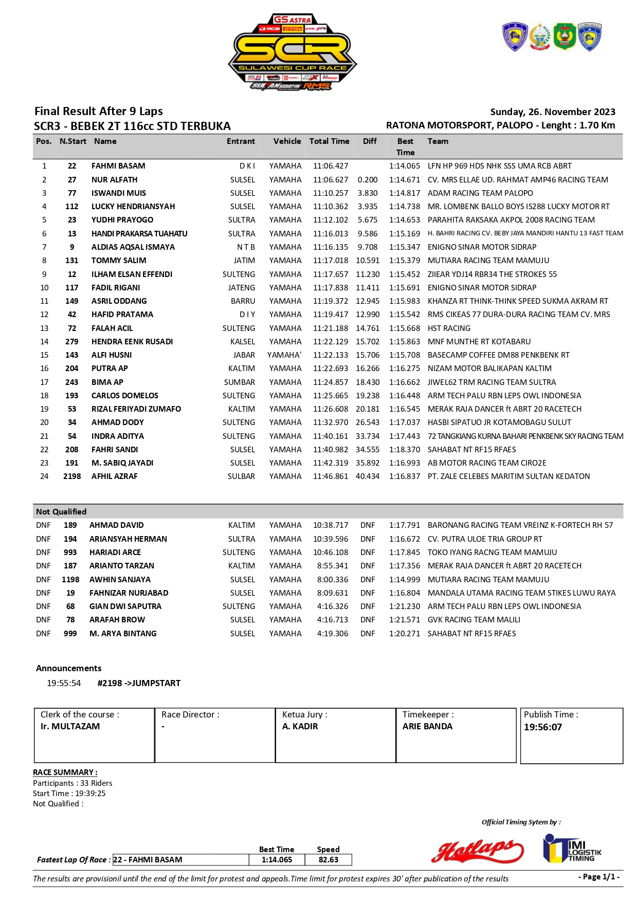 Selamat untuk Basam dan tim LFN HP 969 HDS NHK SSS UMA RCB ABRT20 atas gelar juaranya. Pertarungan sengit memberi tontonan menarik bagi para penonton yang hadir langsung ke Sirkuit. Untuk info lebih lengkapnya, berikut hasil lombanya: