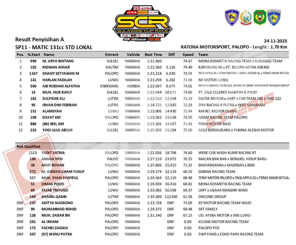Setelah babak penyisihan baru para peserta akan menjalani race. Dan di race ini peserta harus kembali berjibaku untuk menjadi yang terbaik. Berikut adalah daftar nama pebalap yang lolos ke babak Final Matic Lokal 131 STD: