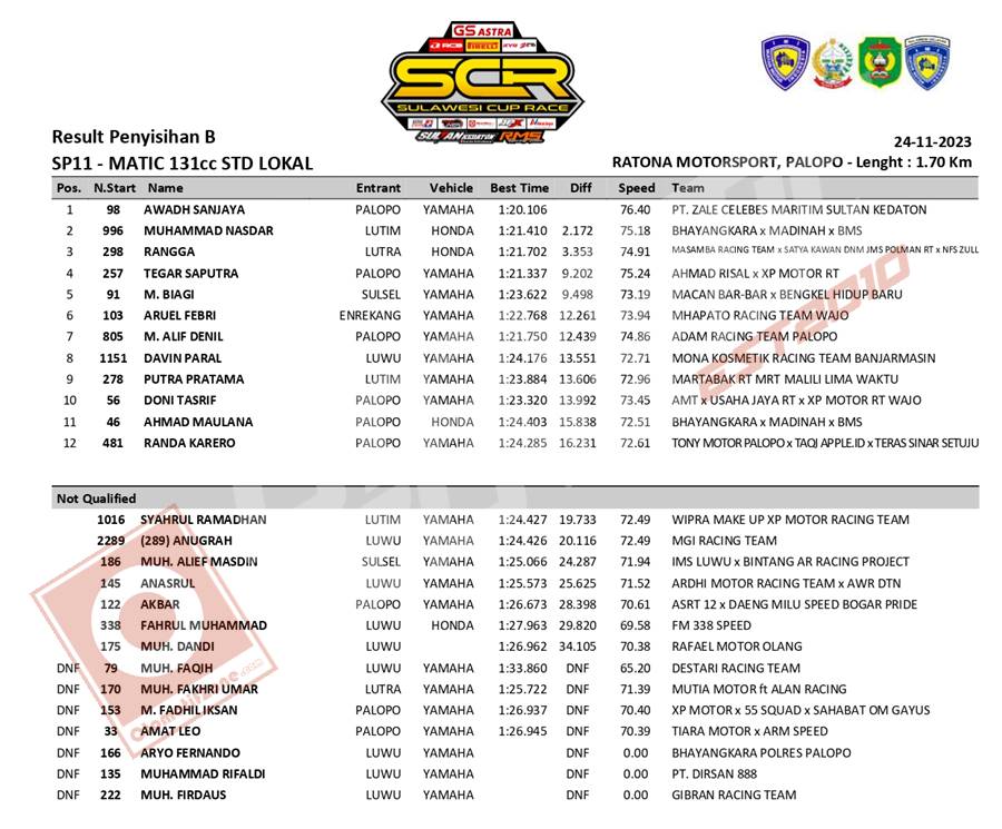 OtomotifZone.com – Palopo. Perjuangan pebalap pebalap lokal pada kelas SP11 atau Matic 131 STD memang luar biasa. Terutama pada Grand Final Sulawesi Cup Race yang berlangsung (26/11/23) di Sirkuit Ratona MotorSport, Palopo, Sulawesi Selatan. Pasalnya para pebalap lokal ini untuk menembus juara harus banyak sesi yang diikuti.