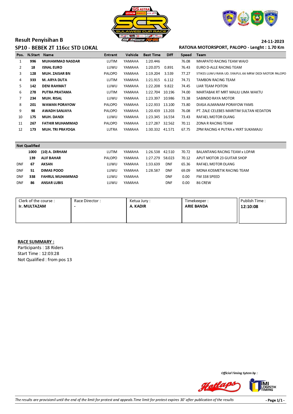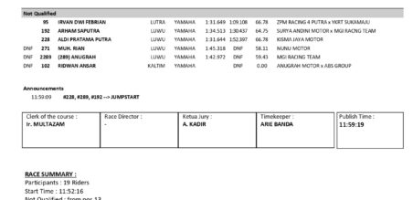 Tentu saja, tujuan utama dari setiap pebalap adalah untuk lolos ke babak final. Dengan semangat yang ngotot, mereka berjuang keras untuk meraih posisi terbaik dalam babak penyisihan ini agar dapat melangkah ke babak final dan berpeluang untuk meraih prestasi di ajang Sulawesi Cup Race 2023. Berikut nama nama pebalap yang lolos ke babak final: