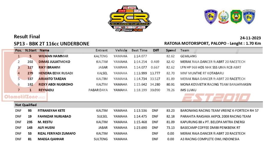 OtomotifZone.com – Palopo. Drama terjadi sejak lepas start dikelas Underbone Sleep Engine 116 atau Sp13 di Grand Final Sulawesi Cup Race yang berlangsung (26/11/23) di SIrkuit Ratona Motorsport, Sulawesi Selatan. Pergantian posisi terus terjadi disetiap lapnya. Dan beberapa tragedy terjadi. Wilman Hammar berhasil menjadi juara pertama dikelas ini.