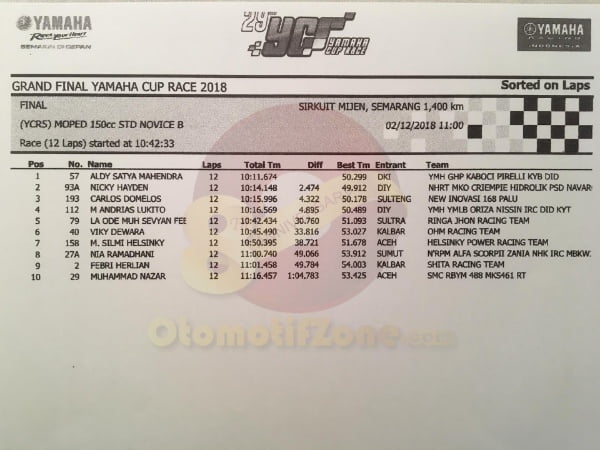 “Tentunya terima kasih untuk semua support dari tim, mekanik, dan keluarga, alhamdulillah bisa juara pertama YCR5”, ujar Aldy Hendra.
