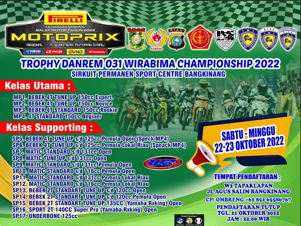 OtomotifZone.com – Pekanbaru. Kabar burung terus bertebaran. Dan kali ini sudah tidak perlu dengar itu lagi. Karena Kejurnas Motoprix Region A Sumatera putaran IV akan diselenggarakan (22-23/10/22) di Sirkuit Sport Center Bangkinang, Riau. W2 Tapak Lapan kali ini yang akan menjadi EO penyelenggaranya. Jadi kalian tidak perlu khawatir.