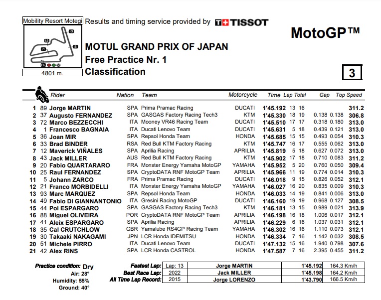 Bisa sedikit memberi gambaran bahwasanya bila sanggup lolos 3 besar di free practice ada sedikit angin segar juga untuk bisa melaju ke Q2 besok siang. Apalagi sirkuit Motegi mempunyai banyak straight panjang berjumlah 5 tempat. Ini sangat menguntungkan pasukan Borgo Panigale. Berikut hasil FP1 MotoGP Motegi.