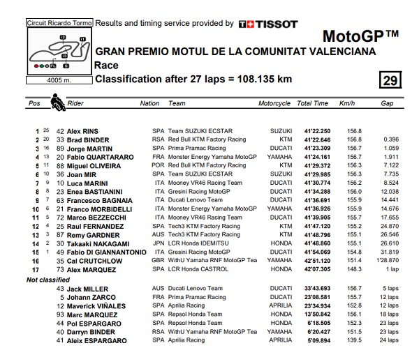 Sementara Quartararo terus mengejar rombongan depan yang di pimpin Alex Rins, Jorge Martin, dan Jack Miller. Outnya Miller kiranya sanggup masuk tiga besar tapi Brad Binder memupus harapannya karena sampai finish posisi empat sudah usaha yang luar biasa bagi Quartararo.