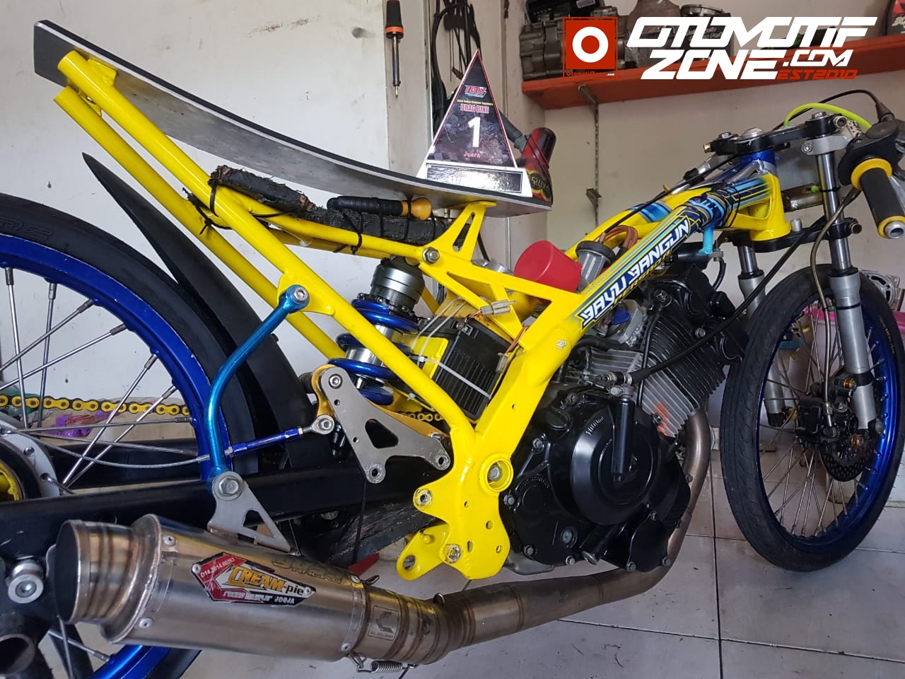 “Alhamdullillah masih bisa berdiri di podium pertama, masih berada di jalurnya. Kelas ini salah satu juga yang berat. Memang terguyur hujan juga Mas. Motor ini semakin tajam waktunya, semakin sip, balap sebelumnya di Bodisa dapat 07,149 detik, sekarang lebih lancip waktunya. Motor engga diapa-apain, Cuma main lebih ngotot aja kemarin,” ucap Trondolo Kudus langsung kepada Penulis.