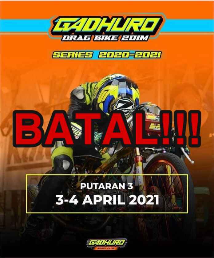 Otomotifzone.com – Tangerang Selatan. Tidak diduga serta disangka akan kabar yang telah dinyatakan oleh pihak penyelenggara event drag bike dari Gadhuro Seri 3 yang sejatinya akan segera dilaksanakan pada akhir pekan nanti (3-4/4/2021) yang berlokasi di Sirkuit NP Lanud Gading Wonosari, Gunung Kidul, Yogyakarta, Jawa Tengah. Sebuah hajat perlombaan balap lurus bagi para pecandu karapan drag motor ini secara resmi dibatalkan oleh pihak penyelenggara balapan.