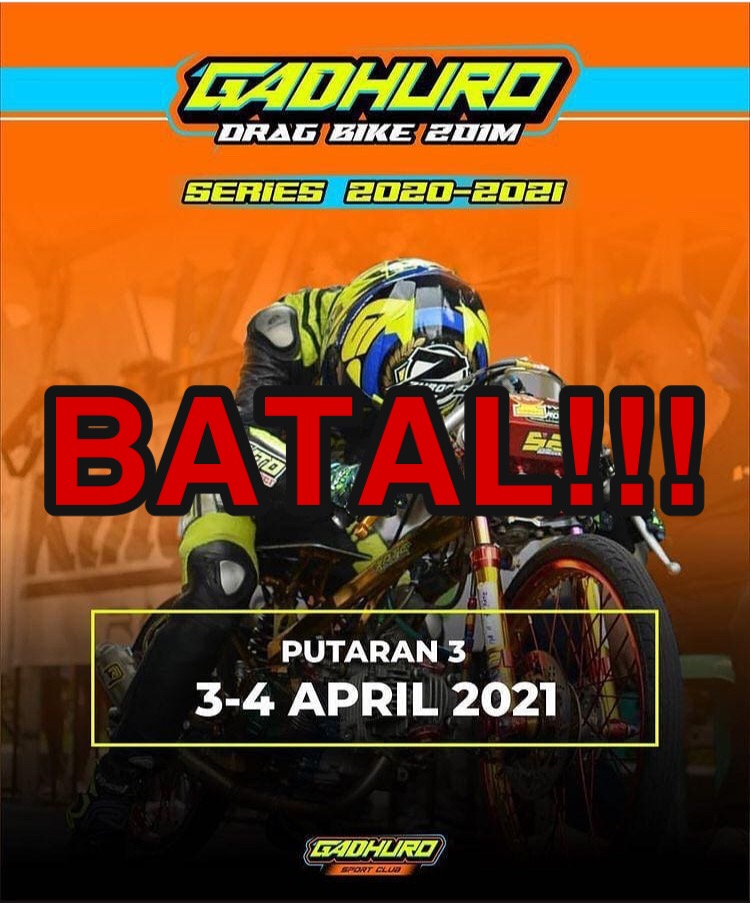 “Mohon maaf yang sebesar-besarnya, Event Gadhuro Drag Bike 201 M Series 2020-2021 Putaran 3 3-4 April 2021 DIUNDUR. Jadwal terbaru akan kami infokan secepatnya. Semoga keadaan cepat membaik. Bagi yang sudah melakukan transfer bisa konfirmasi ke bagian pendaftaran,” cuit dari account instagram @gadhuro_official.