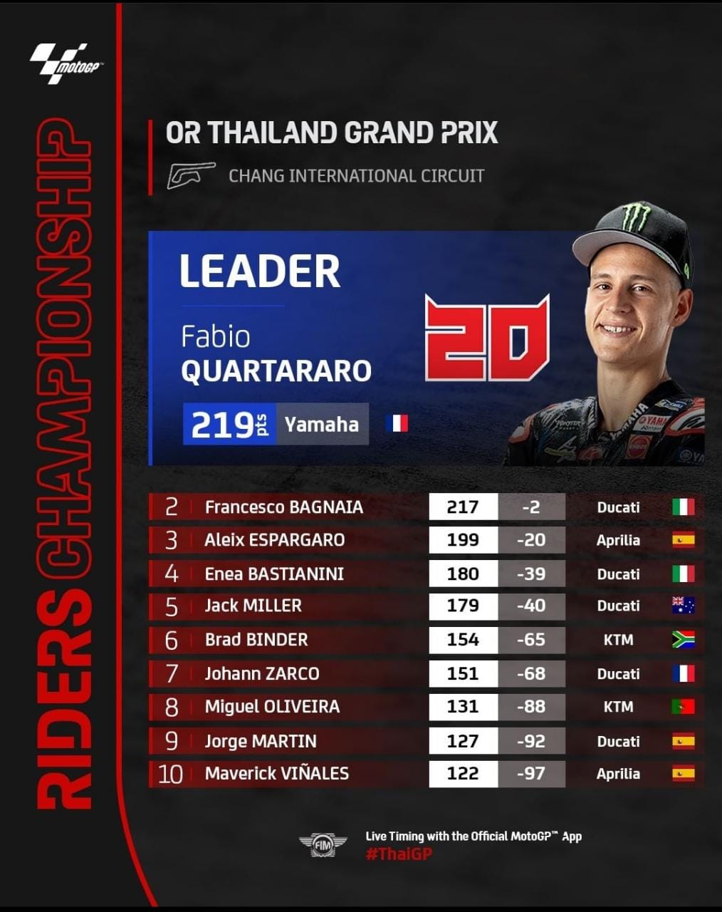Saat ini saja Fabio mengumpulkan 219 point. Sedangkan Bagnaia mengumpulkan 217. Selisih 2 point saja dari pemuncak klasemen sementara. Kejadian ini terjadi setelah balapan di Thailand. Terlebih saat itu Bagnaia finish di posisi ke 3.