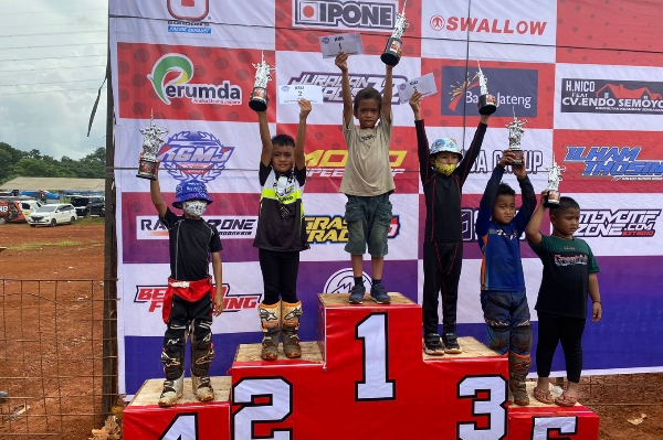 OtomotifZone.com-Jepara. Kejurda Grasstrack Motocross KGMJ Piala Bupati Jepara sirkuit Dian Rakashima area Kelapa Park Jepara 26-27 Februari 2022 akhirnya membawa Gandewo Abimanyu juara pertama kalinya di kelas 50cc setelah berkecimpung kurang lebih setahun ini di kelas pas bocil Motocross sejak awal 2021.