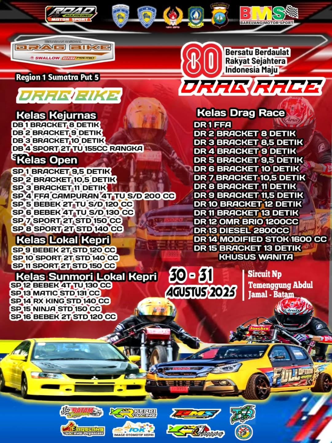 OtomotifZone.com – Batam. Batam akan kembali menjadi pusat perhatian pecinta kecepatan akhir bulan ini. Event Drag Bike & Drag Race Region 1 Sumatera Putaran 5 dijadwalkan berlangsung pada 30–31 Agustus 2025 di Sirkuit NP Temenggung Abdul Jamal, Batam. Ajang bergengsi ini akan mempertandingkan sederet kelas bergengsi, mulai dari kategori Kejurnas, Open, hingga kelas lokal Kepri dan Sunmori Lokal Kepri.