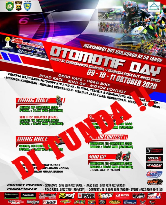 Otomotifzone – Jambi. Gelaran akbar bertema Otomotif Day dalam rangka HUT Kabupaten Muara Bungo, Jambi, ke 55 Tahun yang rencananya bakal di gelar 9 hingga 11 Oktober 2020 mendatang, terpaksa di tunda. Hal itu telah di konfirmasi oleh Sekawan Production, selaku penyelenggara yang semula akan menggelar tiga event sekaligus dalam satu rangkaian (Drag Bike, Road Race & Modification Contest), dan akan dilaksanakan di sirkuit NP Swarnadwipa Nusantara Perumahan Green City Bungo, Jambi.