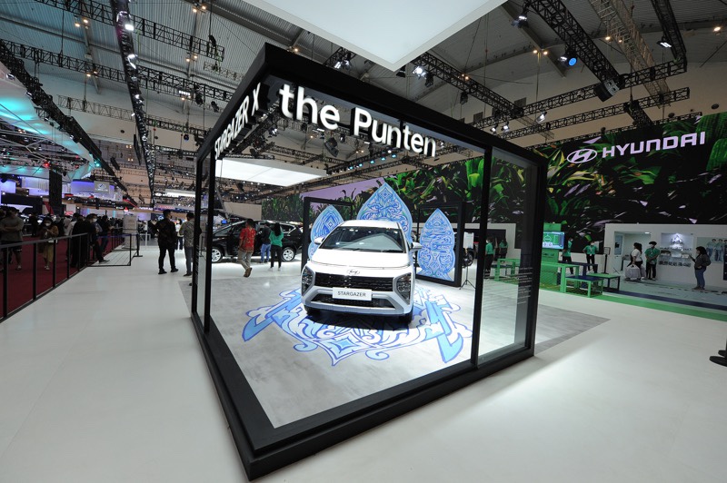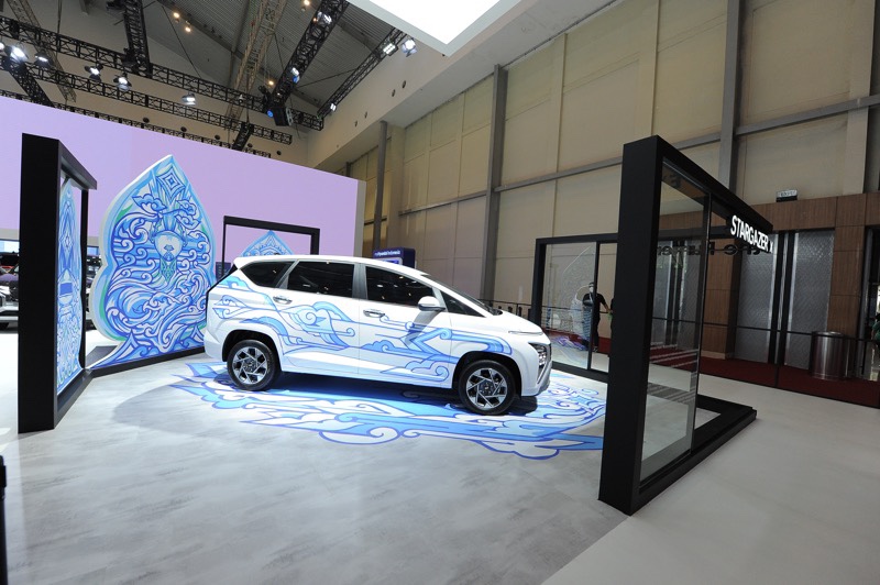 PT Hyundai Mobil Indonesia memang sudah merilis Hyundai Stargazer sebelum GIIAS digelar. Untuk menampilkan sesuatu yang baru mereka menghadirkan art car Hyundai Stargazer yang berkolaborasi dengan seniman, Punten. Sentuhan batik gunungan berwarna biru yang dipasang di bagian body mobil tampak dominan.