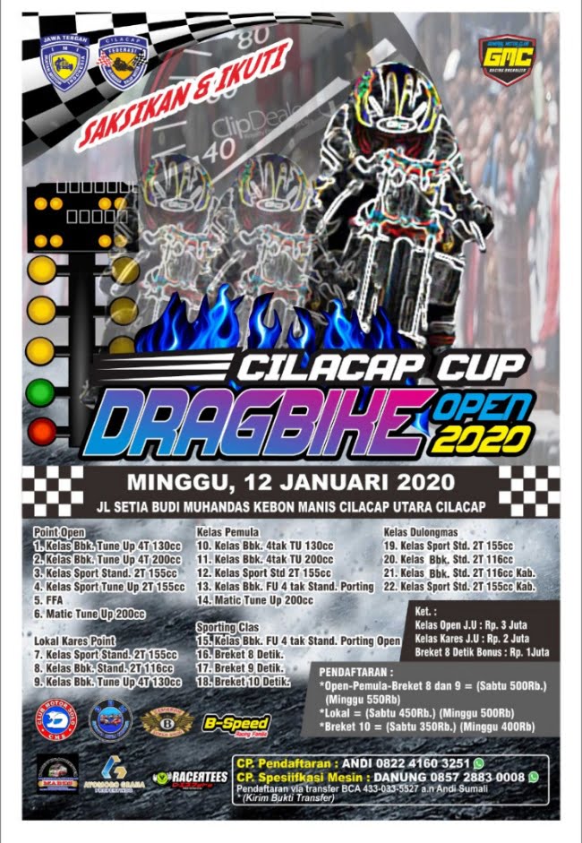 OtomotifZone.com-Cilacap. Bergegas di awal tahun ini GMC Cilacap event organizer yang di pasangi Andi GMC dan kawan-kawan langsung membuka arena adu kebut trek lurus 201m dalam judul Cilacap Cup Dragbike 2020 di sirkuit Jl. Setia Budi, Muhandas, Kebon Manis, Cilacap Utara 12 Januari 2020.