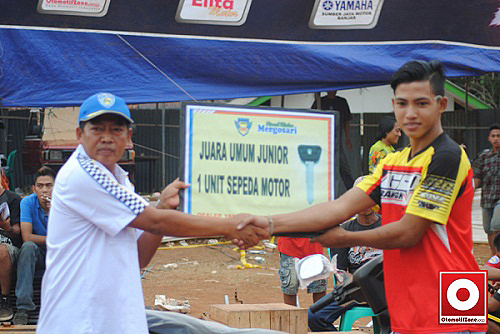 OtomotifZone.com – Cilacap. Cerita sukses GMC – RM Mergosari Supergrasstrack dan Motocross 25-26 Juli 2015 kemarin masih berlanjut. Selain 3 Unit Sepeda Motor untuk Pemula yang diraih Bebeto (43), 1 Unit Sepeda Motor untuk Junior yang diraih (Lotar Mardiyanto), 1 Unit Sepeda Motor untuk kelas Open yang diraih Akbar Taufan (86), juga masih banyak hadiah lain belum terungkap. Ternyata GMC selaku penyelenggara benar-benar memanjakan peserta dan penonton. Wahyu Gareng dari Salatiga di Kelas adventure/trabas dan Veteran 35 diganjar uang tunai 4,5 Juta Rupiah sebagai juara umum dikelas ini. Belum lagi ada doorprize Handphone untuk pembalap yang mendaftar di 3 kelas berbeda, kebetulan diraih Angga Sompie dari Manado.