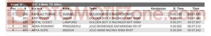 Ali Topan dengan bernamakan Golden Boy x Racing Start WBM sebagai pemimpinnya, dengan torehan waktu 07,479 detik. Pasukan Golden Boy juga menandai event SDC Putaran 2, di kelas matic 200cc sebagai miliknya, pasalnya posisi 1 sampai 3 milik penuh dari Golden Boy.
