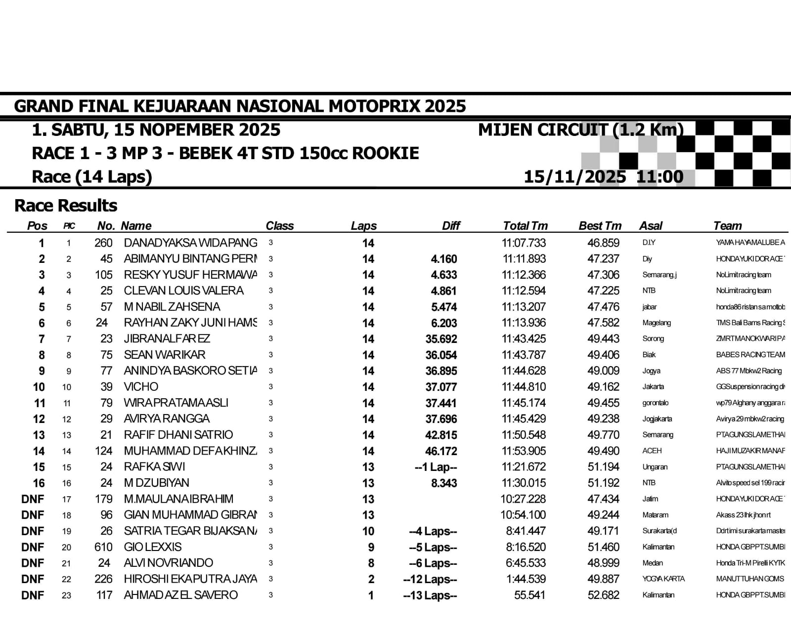Hingga akhirnya bendera finish berkibar, Danadyaksa menyelesaikan balapan dengan keunggulan 0.912 detik dari posisi kedua. Sebuah dominasi yang menunjukkan kualitasnya sebagai pembalap muda yang matang secara mental maupun teknis.