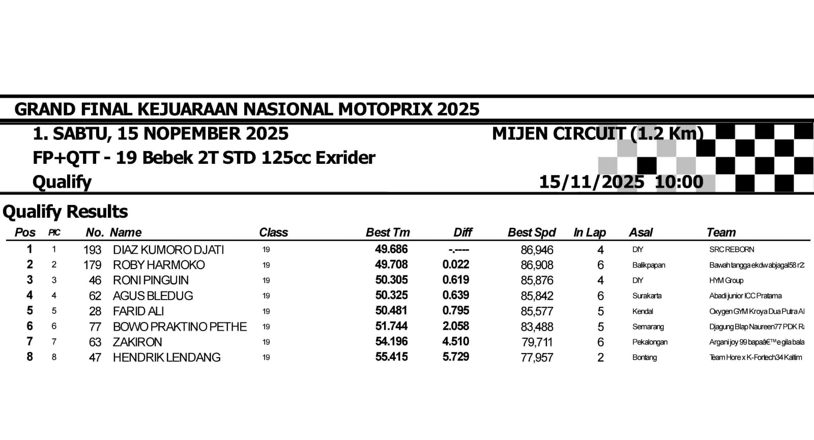 Tanpa banyak basa-basi, Diaz langsung mencatatkan waktu impresif 49.686 detik, sebuah torehan yang tak mampu disamai oleh satu pun rivalnya hingga sesi kualifikasi berakhir. Konsistensi dan kecepatan Diaz terlihat jelas sejak awal, menunjukkan setup motor dan performanya berada pada titik terbaik.