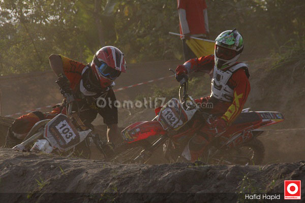 OtomotifZone-Sleman,Jogjakarta. Selain prepare untuk mereka yang mau ikut Grand Final Kejurnas Grasstrack, pembalap road race semacamRezha Danica Arhens dan Daffa Krisna P menyempatkan juga ikut di Kejurda Grasstrack Bupati Sleman Cup Sirkuit Lembah Ngosid, Mojorejo, Tempel, Sleman kemarin. “Kalau latihan aku ya disini mas,” ujar Daffa yang di temani ayahnya. Begitu juga Rezha. Pembalap Yamaha Trijaya yang tahun depan bersama Anggi Permana di Indoprix. Keduanya memang basicnya pembalap grasstrack. “Daffa kan sejak kecil kan ikut minimoto sama Ervantona dan Agus Setyawan, Daffa nusul di belakangnya,” kata Ayah Daffa. Mereka ikut kelas Motocross. Keteteran sih lawan jagoan grasstrack. Maklum, mereka sudah gak main grasstrack. Rezha finish ke-6 Daffa ke-7, juru kunci..