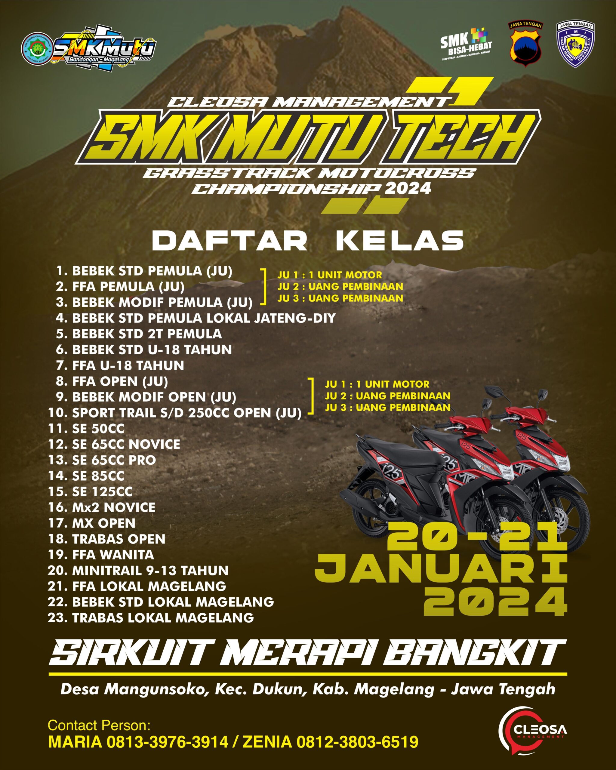 OtomotifZone.com – Magelang. Para pembalap dan tim harus mempersiapkan segala sesuatunya untuk menghadapi event bergengsi awal tahun di Sirkuit Merapi Bangkit, Dukun, Magelang 20-21 Januari 2024 pada event SMK Mutu Tech Grasstrack Motocross Championship bersama Cleosa Management. Dikarenakan apa karena event ini ternyata dipersiapkan hadiah yang cukup istimewa.