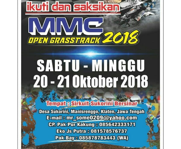 OtomotifZone.com-Klaten. Jawara yang mendominasi kelas pemula area Jawa Tengah beberapa tahun ini bakal absen di event MMC Grasstrack sirkuit Sukorini, Manisrenggo, Klaten 20-21 Oktober 2018 nanti. Pasalnya banyak diantara pembalap-pembalap dalam konotasi pemula kuat seperti Mamo SS, Inggil Bernaditus ikut event Final Powertrack di Bali pada tanggal yang sama. Sedangkan nama lain yang juga di cap pembalap kencang yaitu Prima PP masih belum merasa pulih tulunjuk tangan kirinya sehabis rentetan kecelakaan yang menimpa dirinya dari Grasstrack Magelang dan Powertrack Dieng.