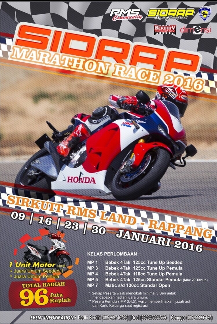 Di Sirkuit RMS Land kembali diadakan latihan bersama dengan nuansa kompetisi, kegiatan ini bertakjuk Sidrap Marathon Practice Night Race yang diselenggarakan sebulan non-stop setiap minggunya dan para pembalap yang hadir minimal 3 seri berhak atas 1 unit sepeda motor jika berhasil mengumpulkan point tertinggi selama 4 seri latihan tersebut. Sepertinya bakalan seru nih sambil setting untuk persiapan musim balap 2016, apalagi ada hadiah 1 unit sepeda motor.