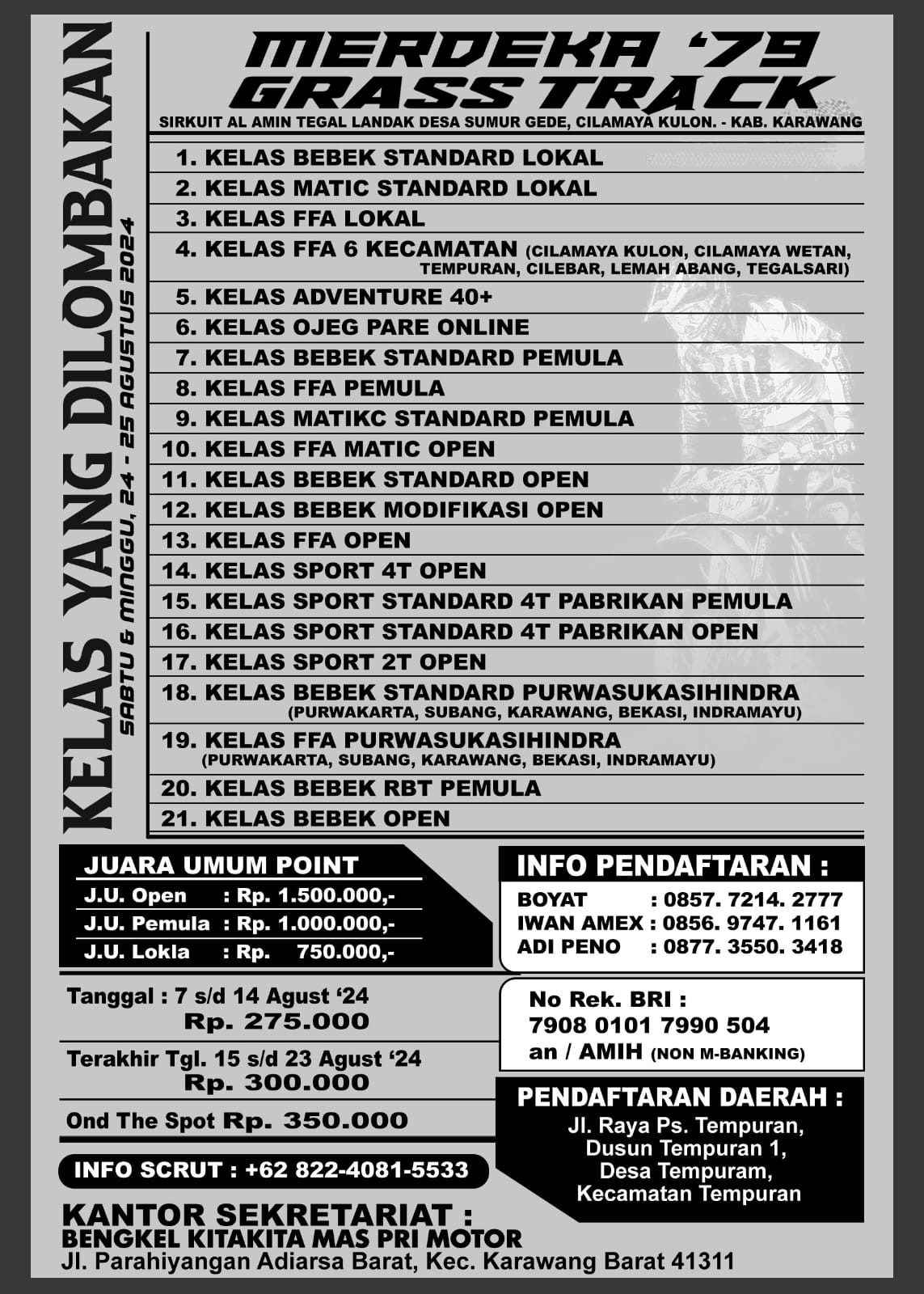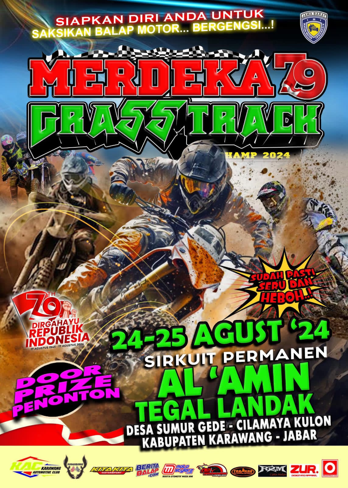 OtomotifZone.com – Karawang. Lama sekali kita tidak mendengar event garapan Karawang Automotif Club besutan Herdi Risch. Pria dengan sejuta pengalaman didunia otomotif Indonesia akhirnya kembali menggelar event akbar. Kali ini menyambut kemerdekaan, event bertajuk Merdeka 79 Grasstrack 2024 siap berjalan (24-25/8/24) di Sirkuit Al Amin Tegal Landak, Desa Sumur Gede, Kab. Karawang. Tidak main main memang KAC kalau menggarap event, hadiah berlimpah menjadi ciri khasnya.