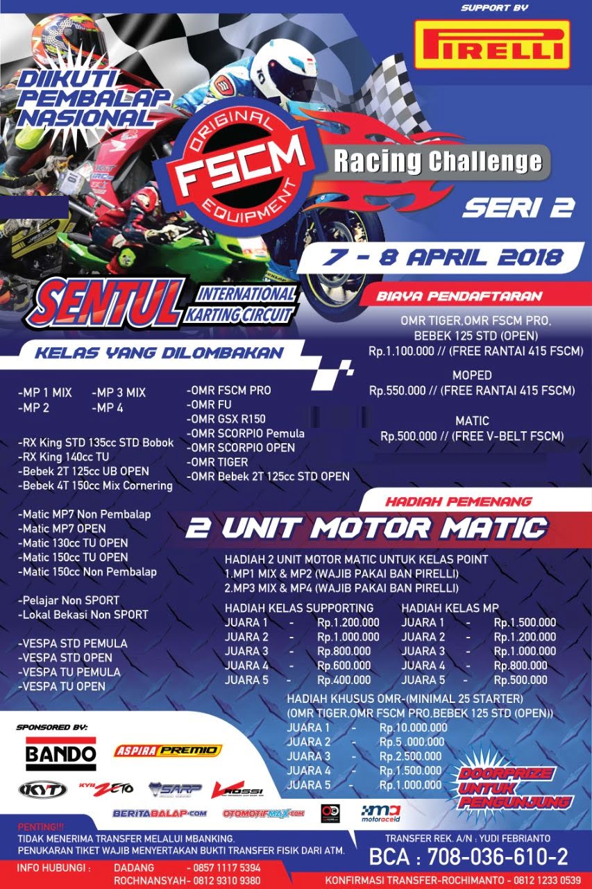Otomotifzone.com – Jakarta. Akhir pekan ini (7-8/4) Sirkuit Internasional Karting Sentul, Bogor akan menjadi saksi gelaran FSCM Racing Challenge 2018. Yang mana event ini akan memberi hadiah yang sangat bombastis. Dua Unit sepada motor sudah disiapkan untuk juara umum di dua katagori yang diperlombakan. Selain itu uang tunai ratusan juta rupiah juga disediakan untuk uang pembinaan.