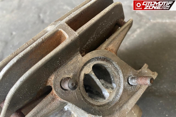 Paling terlihat ada di perut silindernya. Thoriq mencoba buat bagian Ex ada sekat tengah. “Jadi dalemannya di modifikasi pakai daging silinder baru lalu di buat dua lubang. Dengan demikian ada part yang terbantu lebih awet. Salah satunya ring piston tidak banyak menggesek lubang ex. Karena lubang tersebut agak lebar jadi rata-rata motor spek ini boros ring piston sebelumnya,” ungkap Thoriq.
