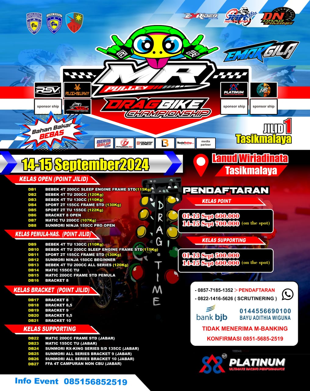 Yuk warga Tasikmalaya — Jawa Barat, dan sekitarnya para pecinta otomotif drag bike. Segera persiapkan, dan jangan lupa ikuti gelaran balap garapan dari Kuya Nyuruntul di September 2024 mendatang.