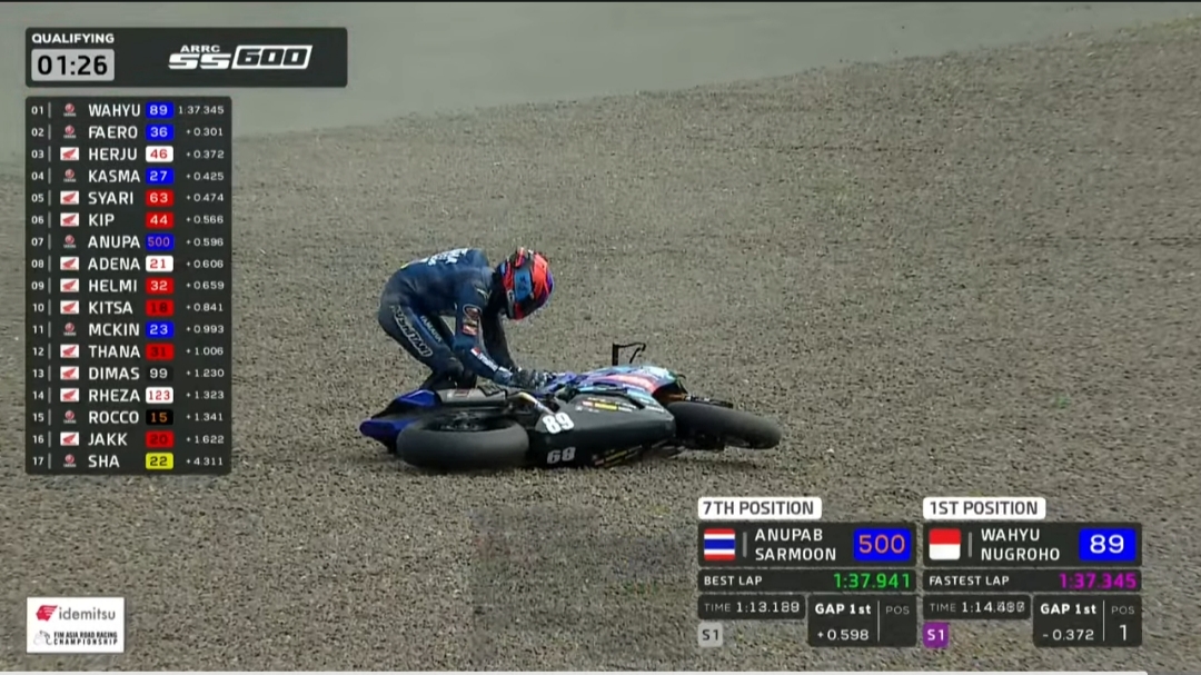 Namun selang satu menit berputar Wahyu alami slide roda depan dan terhempas ke gravel. Untungnya tak ada cedera berartu meski wearpack robek cukup banyak. Waktu selesai dan akhirnya Wahyu teken pole perdana! Moment Wahyu yang cukup hard tercipta di home race 2025.