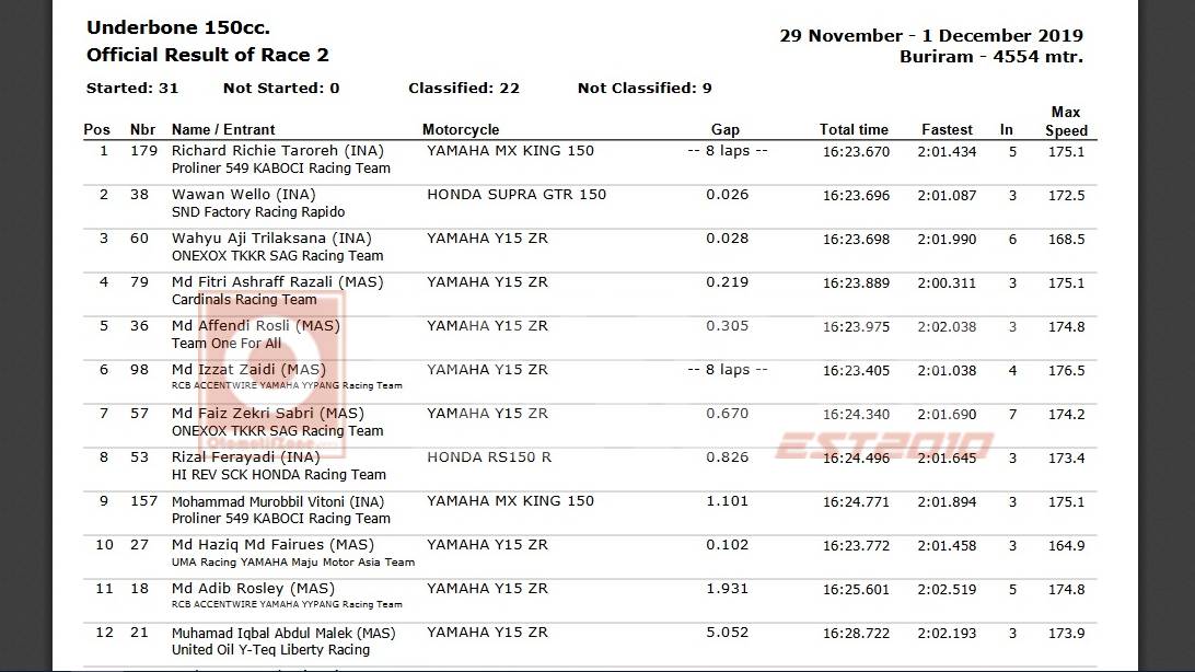 Memang sangat seru persaingan di kelas UB150 ARRC. Terlebih pada putaran terakhir akhir pekan kemarin. Hampir sangat rapat posisi finish yang terjadi. Pada hasil memutuskan M Izzat Zaidi berada di posisi pertama, Richard Taroreh di posisi kedua dan Wawan Wello pada posisi ketiga.