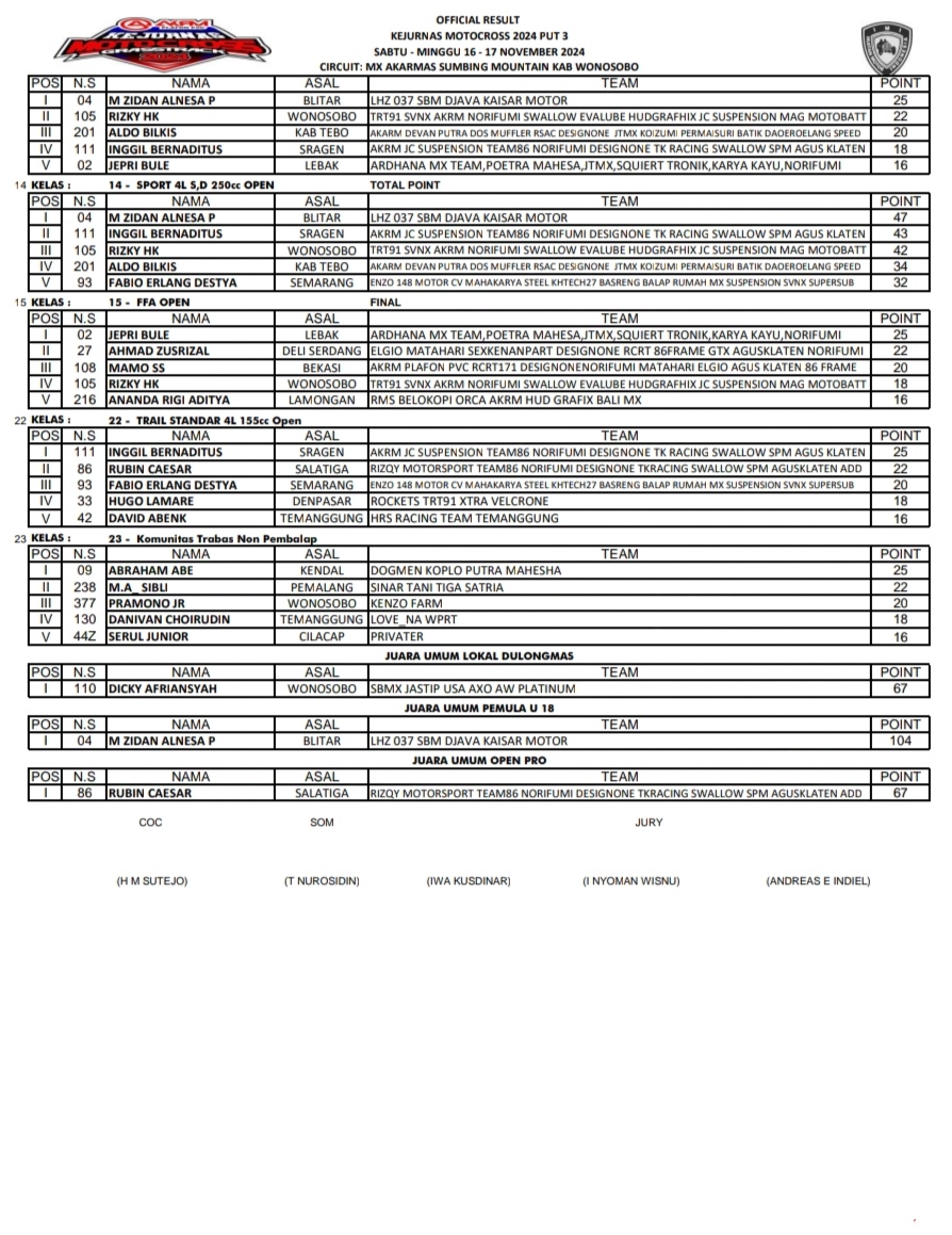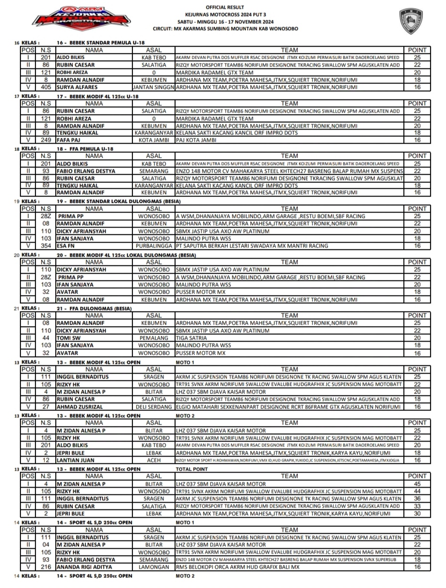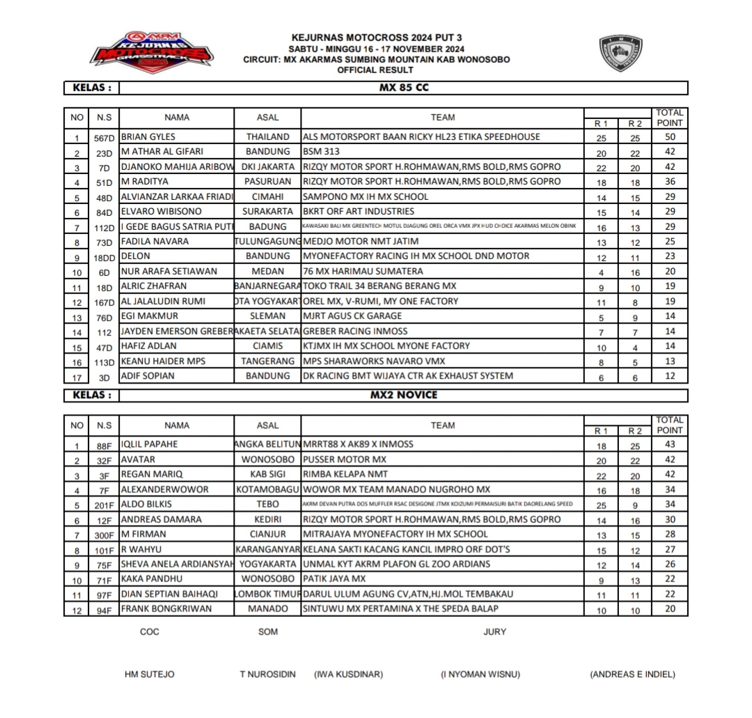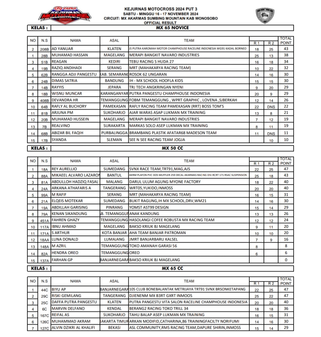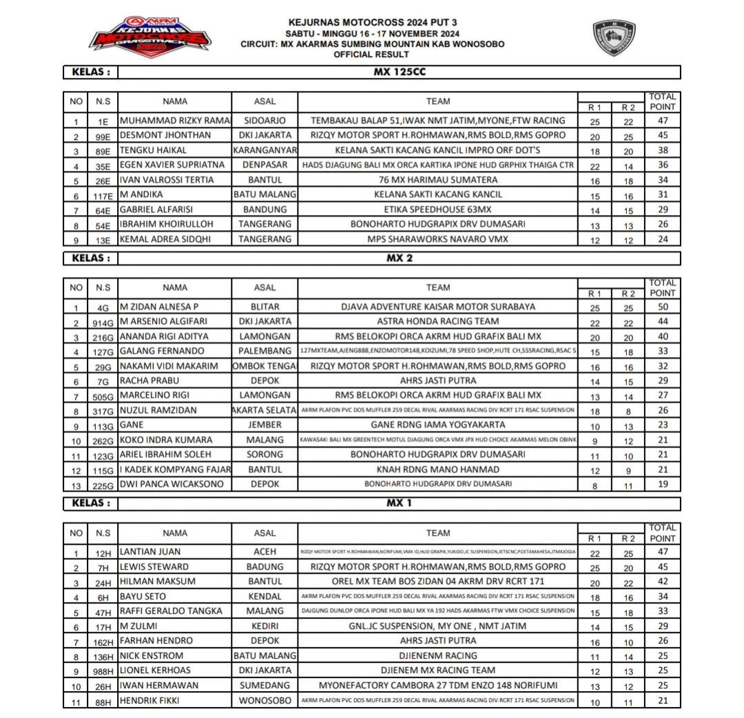 OtomotifZone.com – Wonosobo. Berikut hasil race Final Kejurnas Motocross AKRM Sirkuit Akarmas Gunung Sumbing Wonokriyo, kembaran, kec Kalikajar, kab. Wonosobo Jawa Tengah 15-17 November 2024