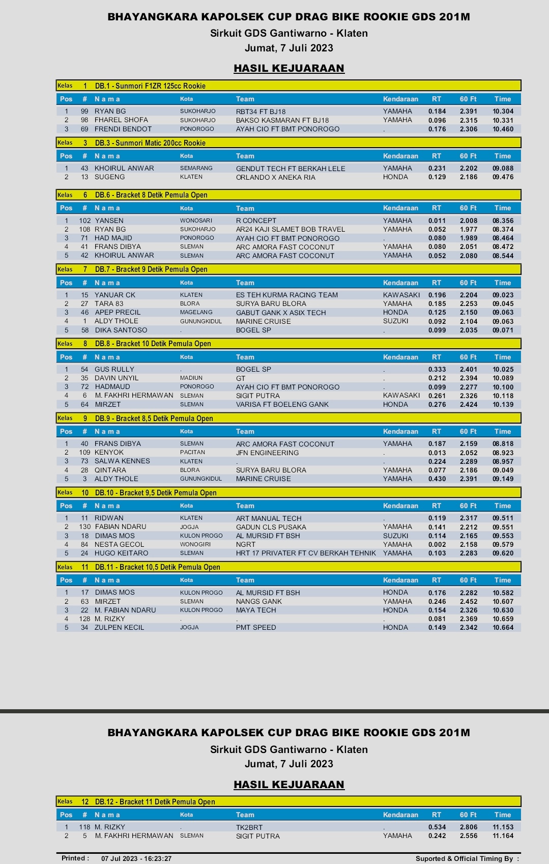 OtomotifZone.com-Klaten. Balap Kapolsek CUP Dragbike Rookie GDS Klaten 7 Juli 2023 selesai terlaksana dengan baik. Kelas seru bagi rookie musim ini bisa di simak pada hasil lomba di bawah ini.