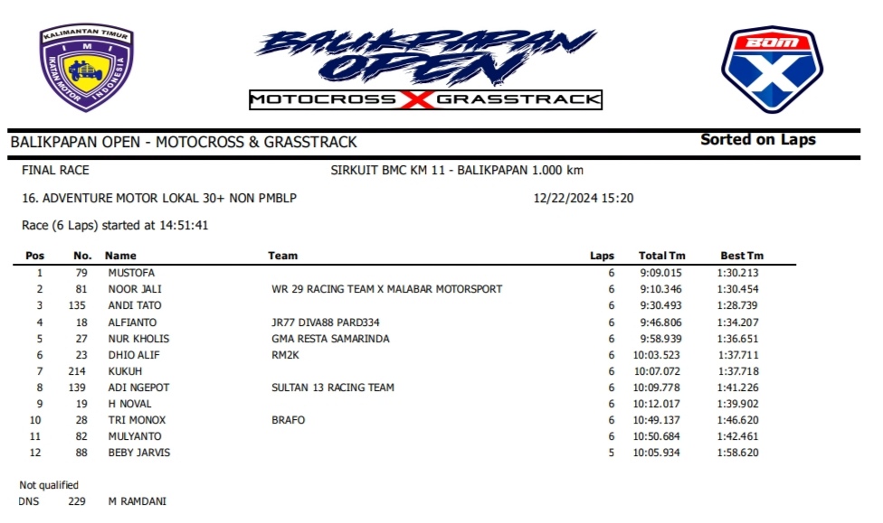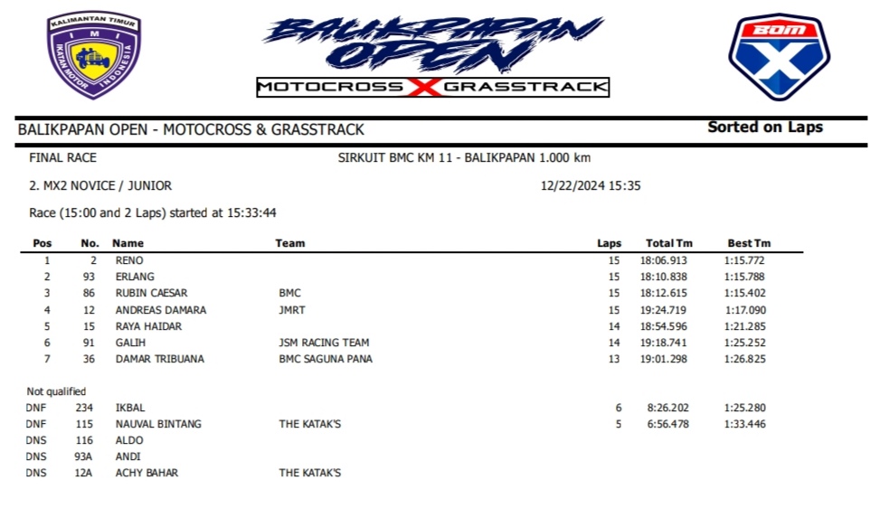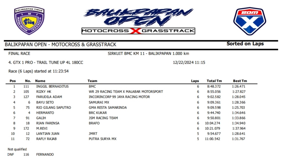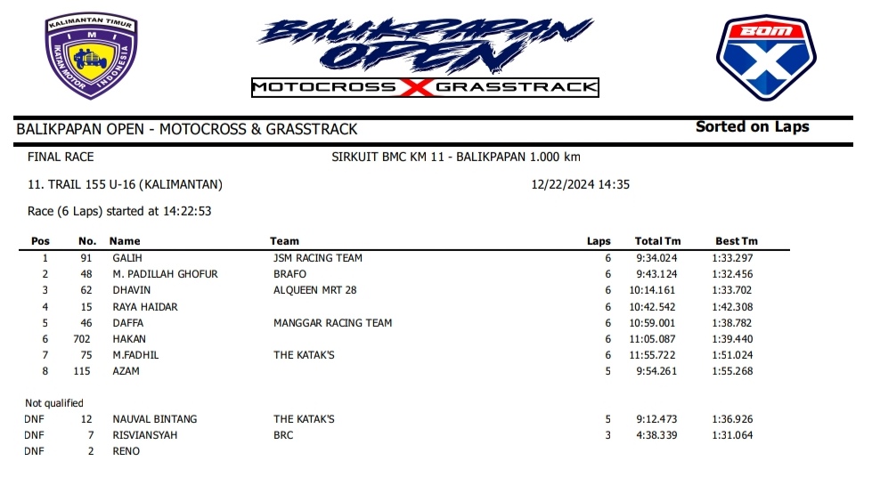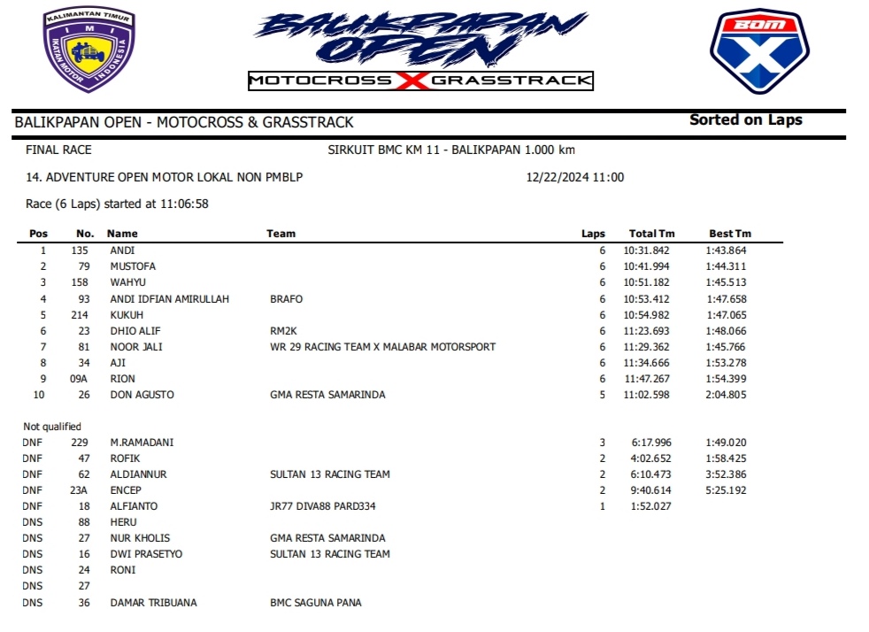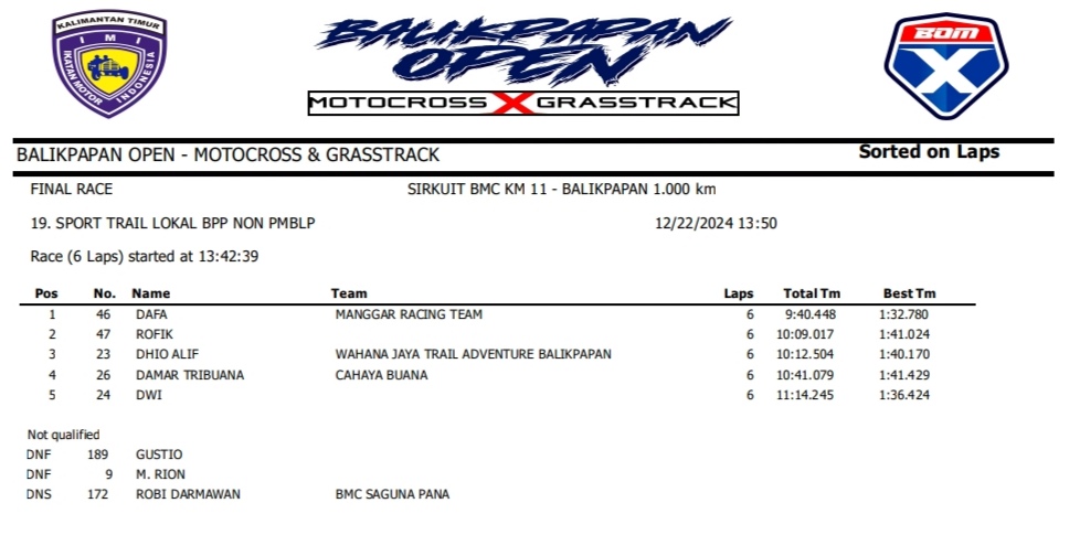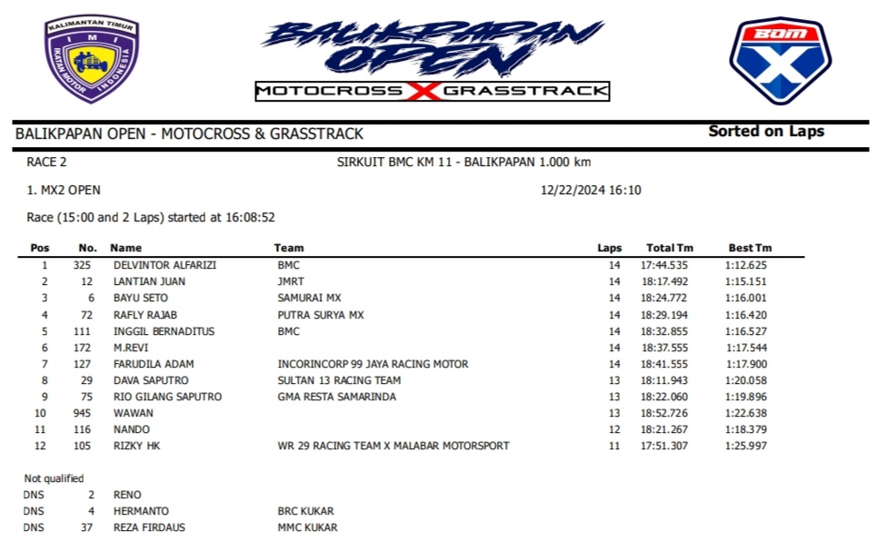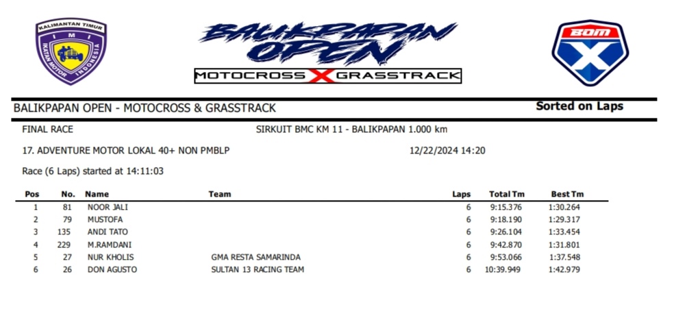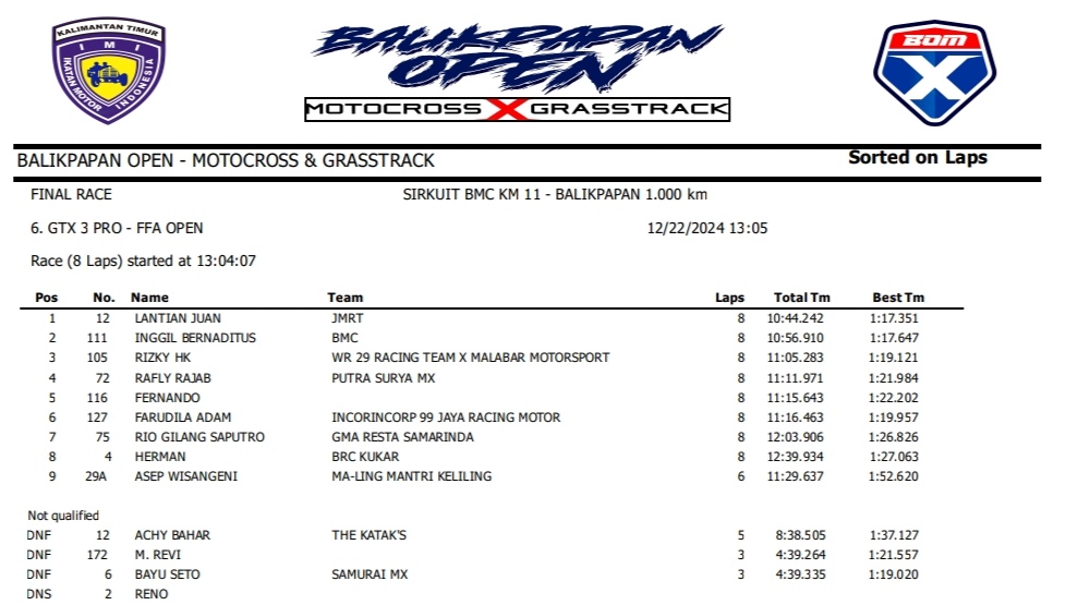 OtomotifZone.com – Balikpapan. Peserta dari Jawa Tengah dan Jawa Timur banyak beraksi pada event ini. Mulai pembalap pemula, Senior sampai pembalap MXGP. Berikut hasil dari event akbar BOM X Grasstrack Motocross sirkuit BMC Balikpapan 21-22 Desember 2024.