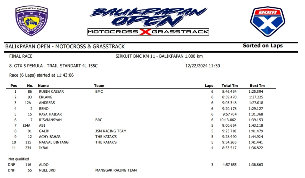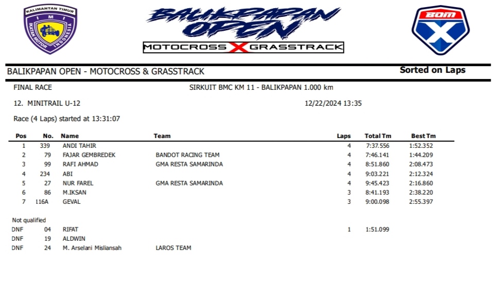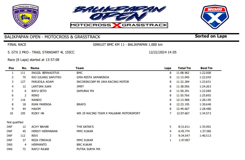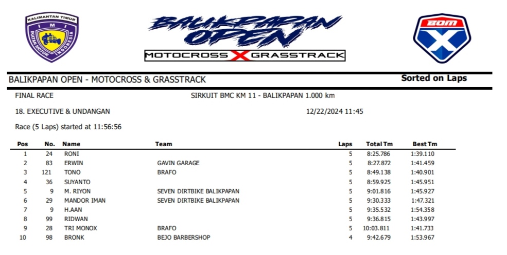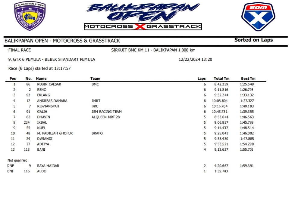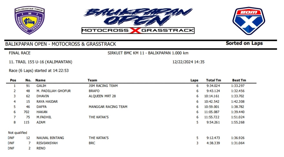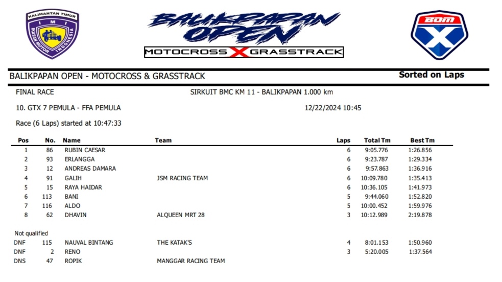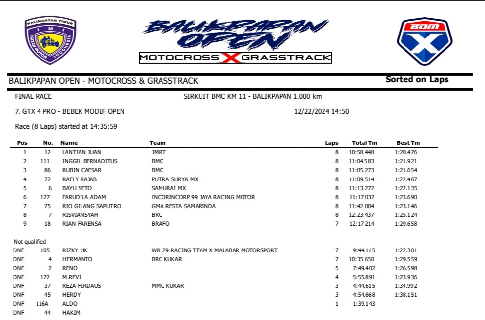 OtomotifZone.com – Balikpapan. Peserta dari Jawa Tengah dan Jawa Timur banyak beraksi pada event ini. Mulai pembalap pemula, Senior sampai pembalap MXGP. Berikut hasil dari event akbar BOM X Grasstrack Motocross sirkuit BMC Balikpapan 21-22 Desember 2024.