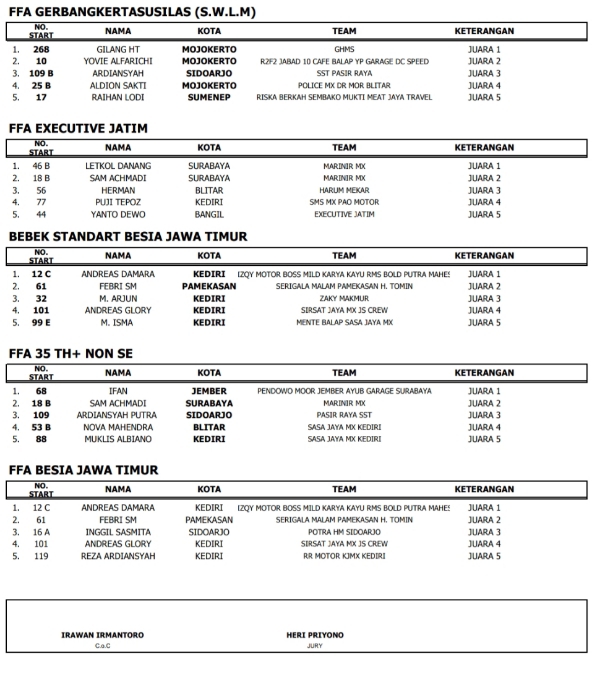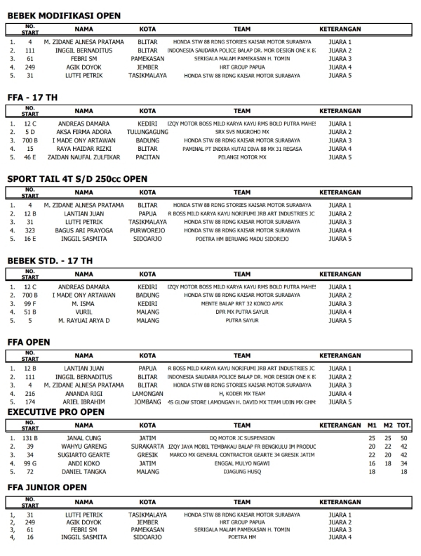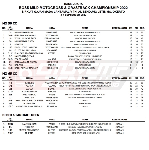 Racing Roda 2GrasstrackMotocrossRace Results Hasil Boss Mild Motocross Grasstrack Mojokerto 2022 Penulis Hafid Hapid - 6 September 2022 0 321 FacebookXPinterestWhatsApp OtomotifZone.com-Mojokerto. Berikut hasil event pertama pada tahun ini yang diadakan Boss Mild Motocross Grasstrack sirkuit Gajah Mada Lamtamal V TNI AL, Bendung Jetis, Mojokerto, Jawa Timur 3-4 September 2022. Penulis : Hafid | Foto : Hafid
