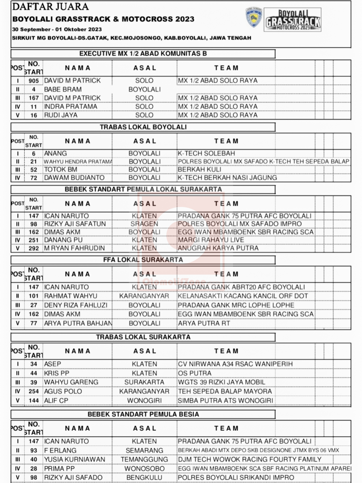 Racing Roda 2GrasstrackMotocrossRace Results Hasil Boyolali Grasstrack Motocross 2023 Penulis Hafid Hapid - 2 Oktober 2023 0 357 FacebookXPinterestWhatsApp OtomotifZone.com-Boyolali. Berikut hasil dari Boyolali Grasstrack Motocross sirkuit MG Boyolali Kota tanggal 30 September dan 1 Oktober 2023.