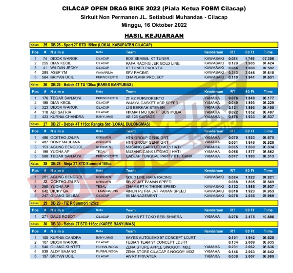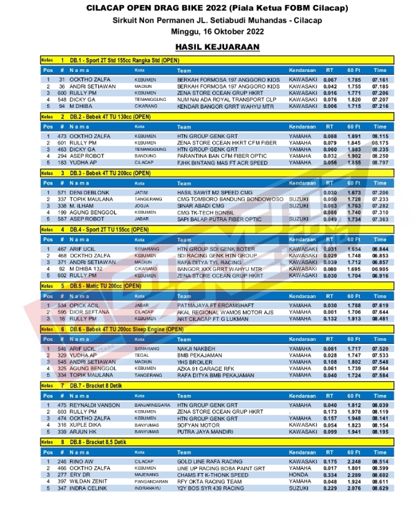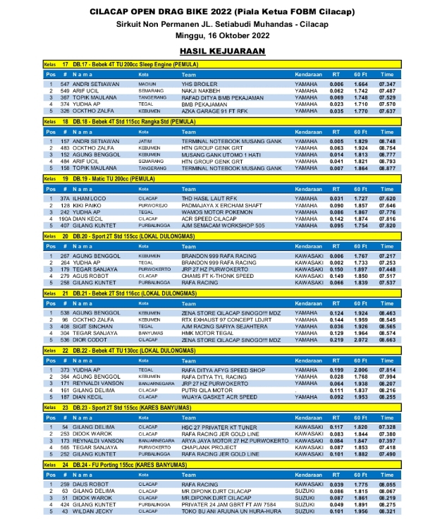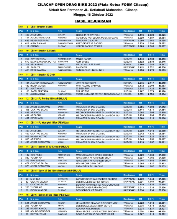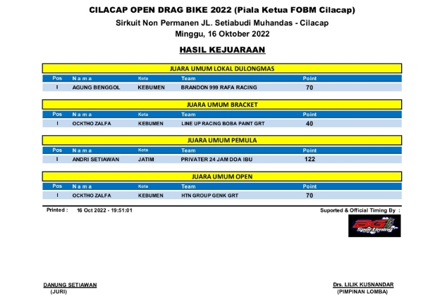 Racing Roda 2Drag BikeRace Results Hasil Cilacap Open Drag Bike 2022 Penulis Hafid Hapid - 17 Oktober 2022 0 222 FacebookXPinterestWhatsApp OtomotifZone.com-Cilacap. Berikut hasil Cilacap Open Drag Bike piala ketua FOBM Cilacap di sirkuit Jl. Setia Budi, Muhandas, Cilacap 16 Oktober 2022.