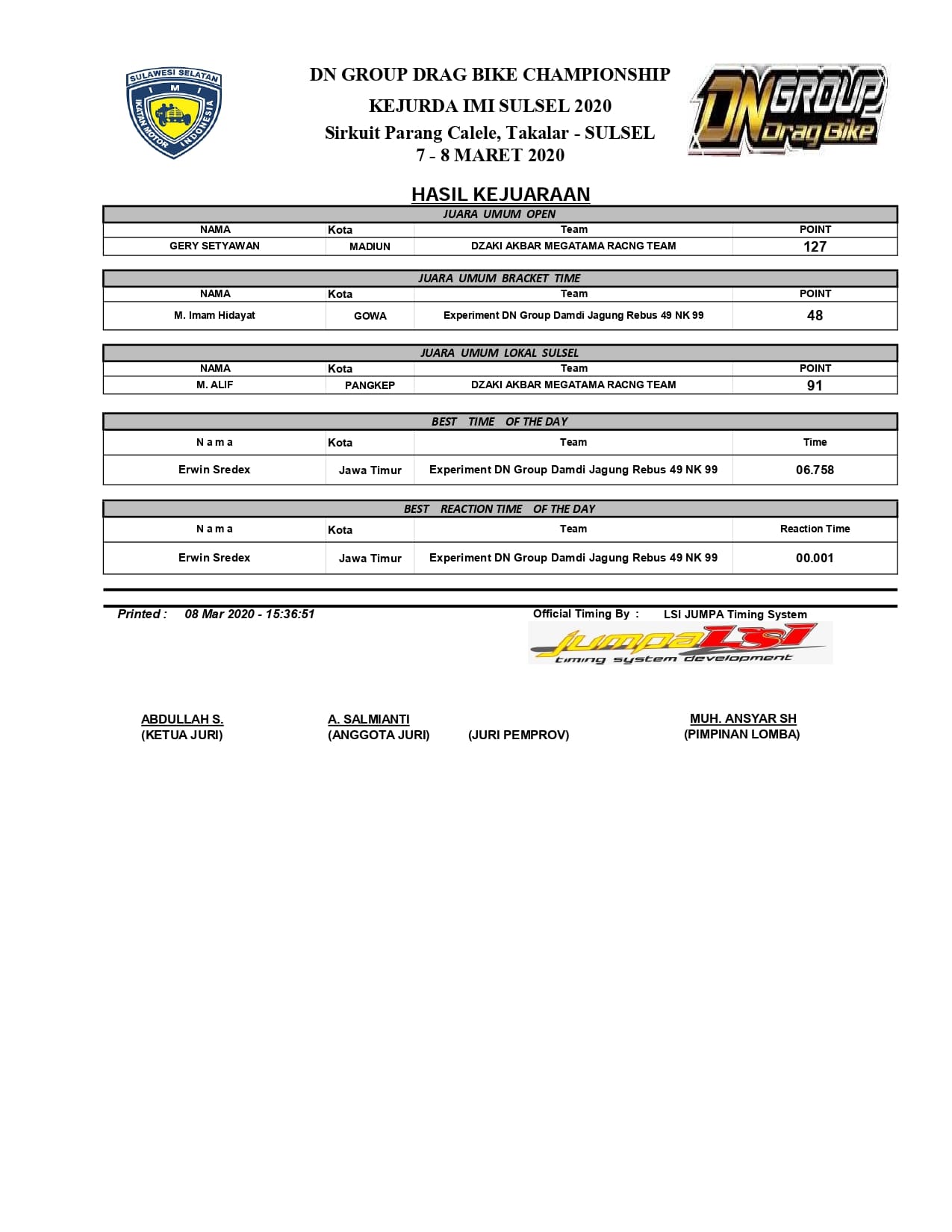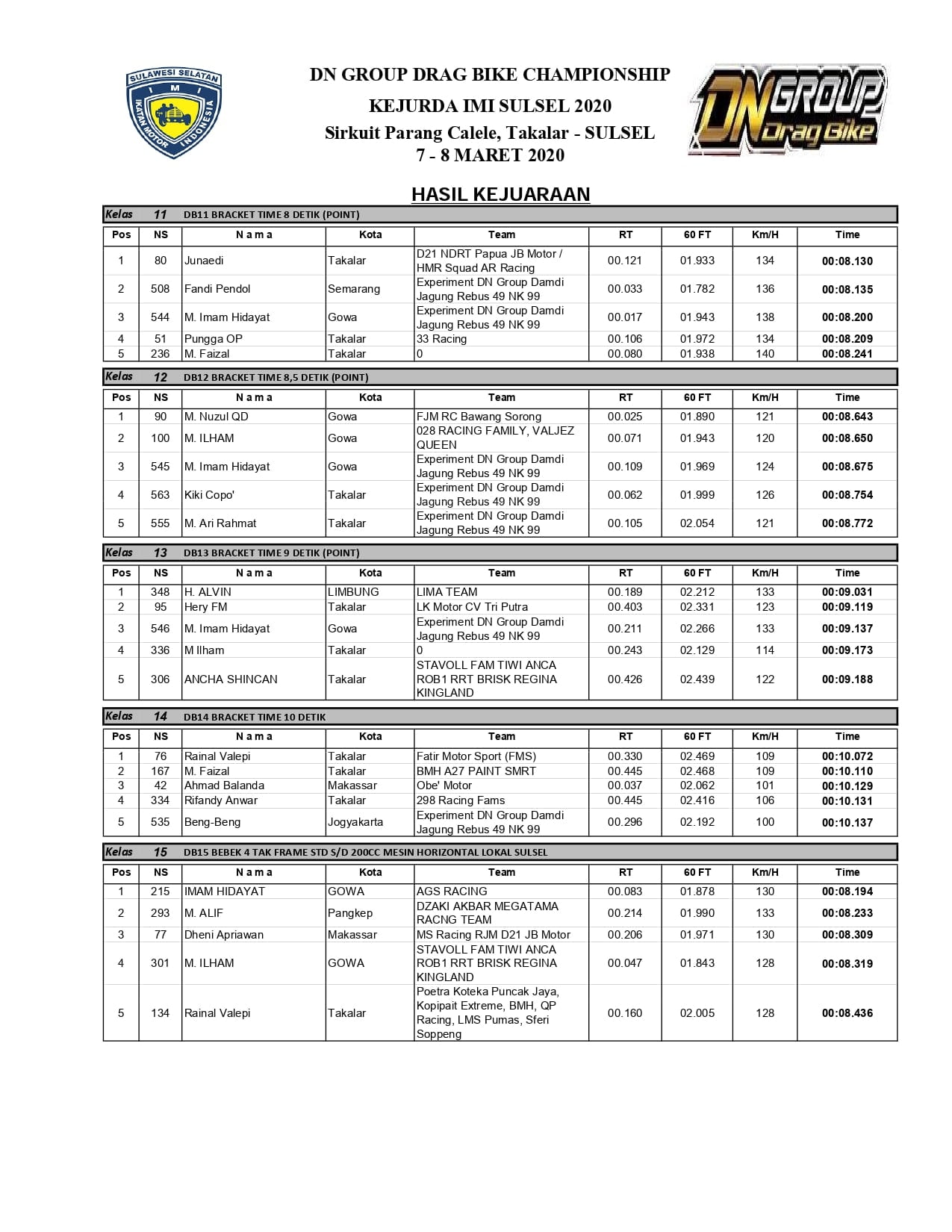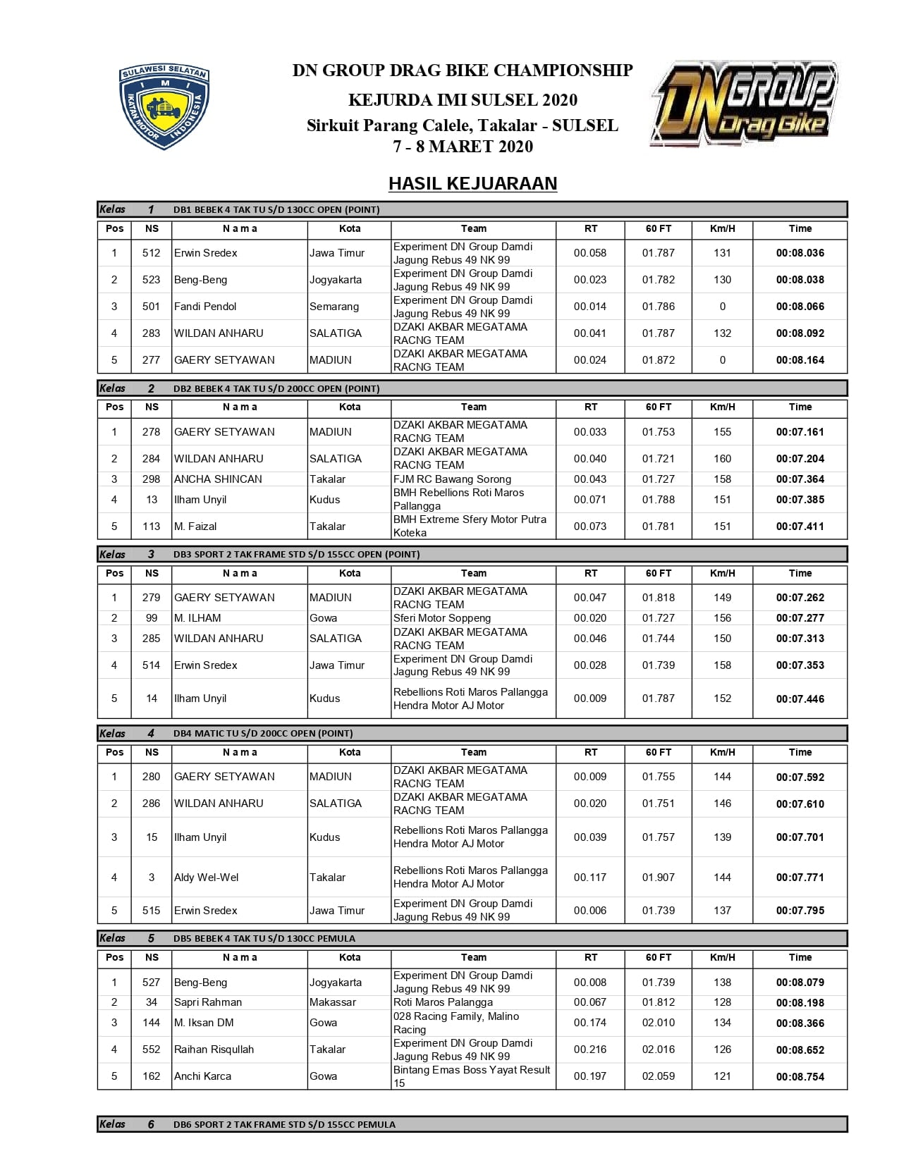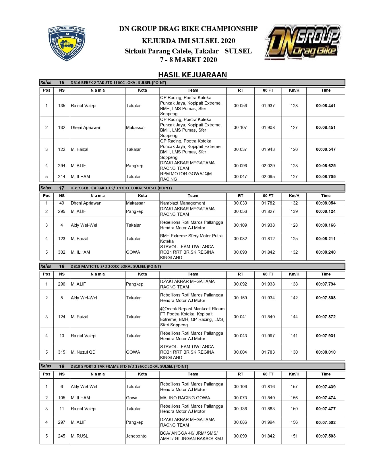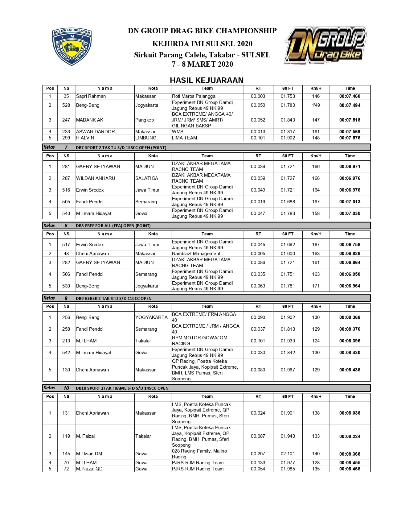 Racing Roda 2Drag Bike Hasil DN Group Drag Bike Championship Kejurda IMI Sulawesi Selatan 2020 Penulis Aji Wawan - 8 Maret 2020 0 404 FacebookXPinterestWhatsApp Berikut ini adalah hasil DN Group Drag Bike Championship Kejurda IMI Sulawesi Selatan 2020 yang diselenggarakan di Sirkuit Parang Calele, Takalar, Sulawesi Selatan pada tanggal 7-8 Maret 2020